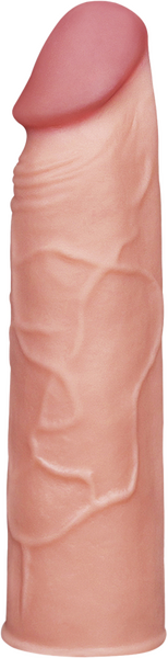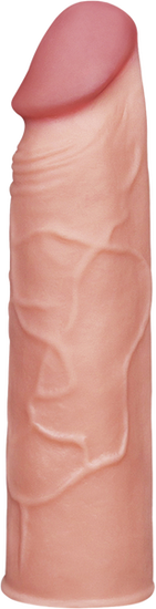 This ultra-realistic penis extension sleeve provides a length enhancement of 1 inch and a 30% increase in girth. The realistic head and veiny shaft enhance sensation for the receiver. It is made from temperature-responsive, real-feel material, with a total length of 6.8 inches, an internal length of 5.3 inches, and a canal diameter of 1.2 inches.