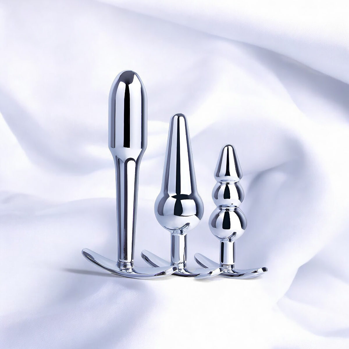 Indulge in the sophistication of our 3 in 1 Metal Butt Plug Kit Set available at our adult store. Designed with a luxurious T-Bar base and a convenient pull ring, each plug boasts a unique size and shape for a tailored experience. Crafted from high-quality metal with a high glossy finish, these plugs are a must-have for the refined pleasure seeker.