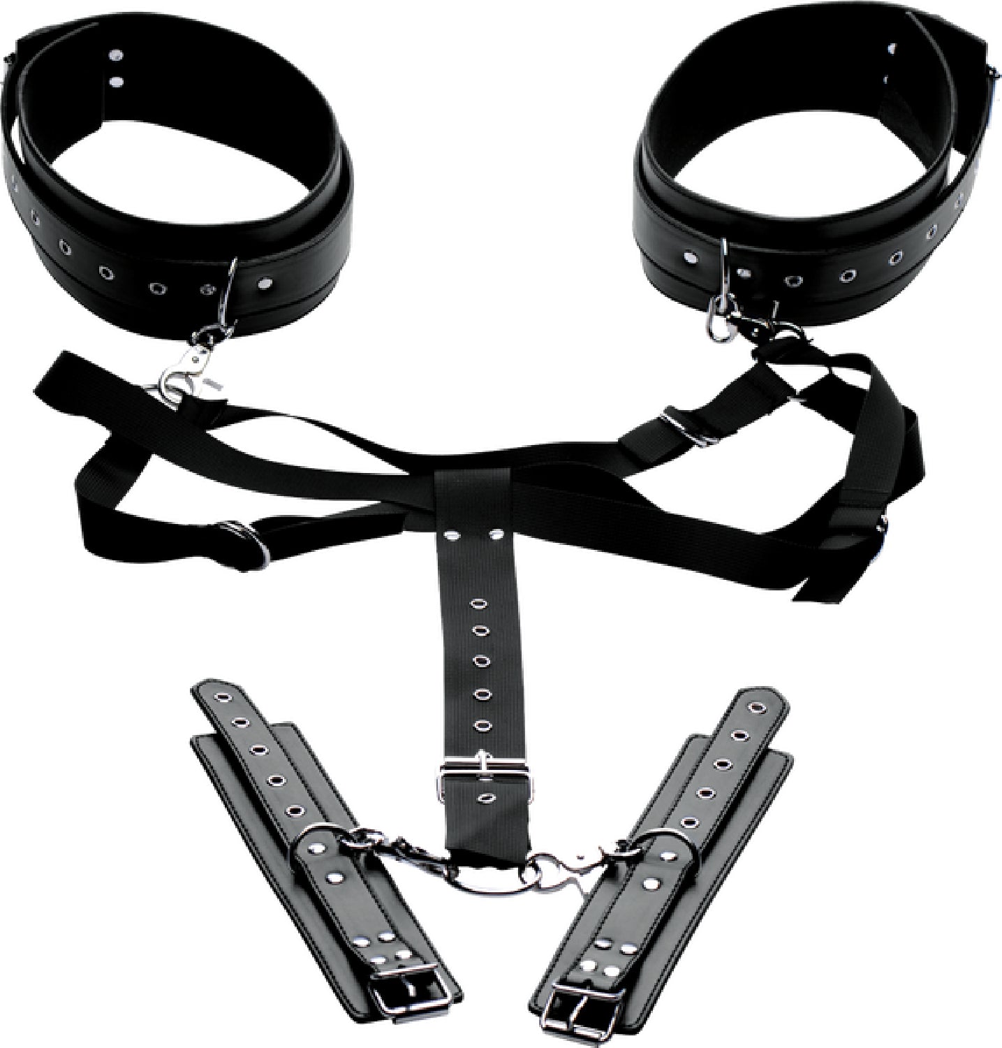 Measurements: Back strap adjusts from 5 to 10 inches. Wrist cuffs adjust from 6 to 10 inches in circumference. Thigh cuffs adjust from 13 to 23 inches in circumference. Chest strap adjusts up to 45 inches in circumference.