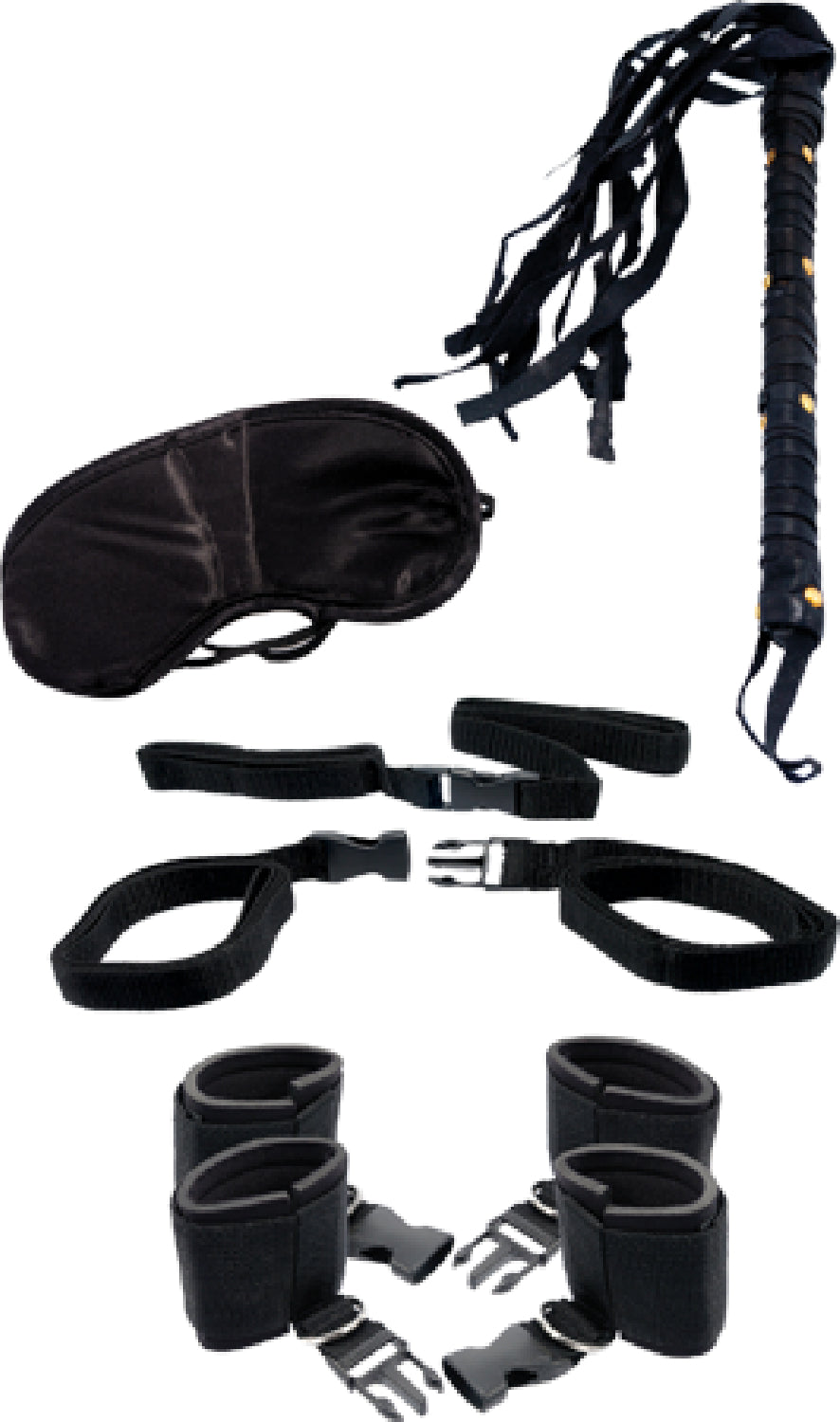 Explore each other's naughtier side with this all-in-one beginner's bondage kit. Perfect for couples who've always wanted to try bondage, this kit has everything you need to start having fun with fetish. This kit includes: ankle straps, wrist restaints, leather whip, satin mask, and 4 bedpost extensions. The restraints and bedposts are interlocking, giving you endless pleasure possibilities by simply connecting the clips together. Go ahead, dare to get naughty!
