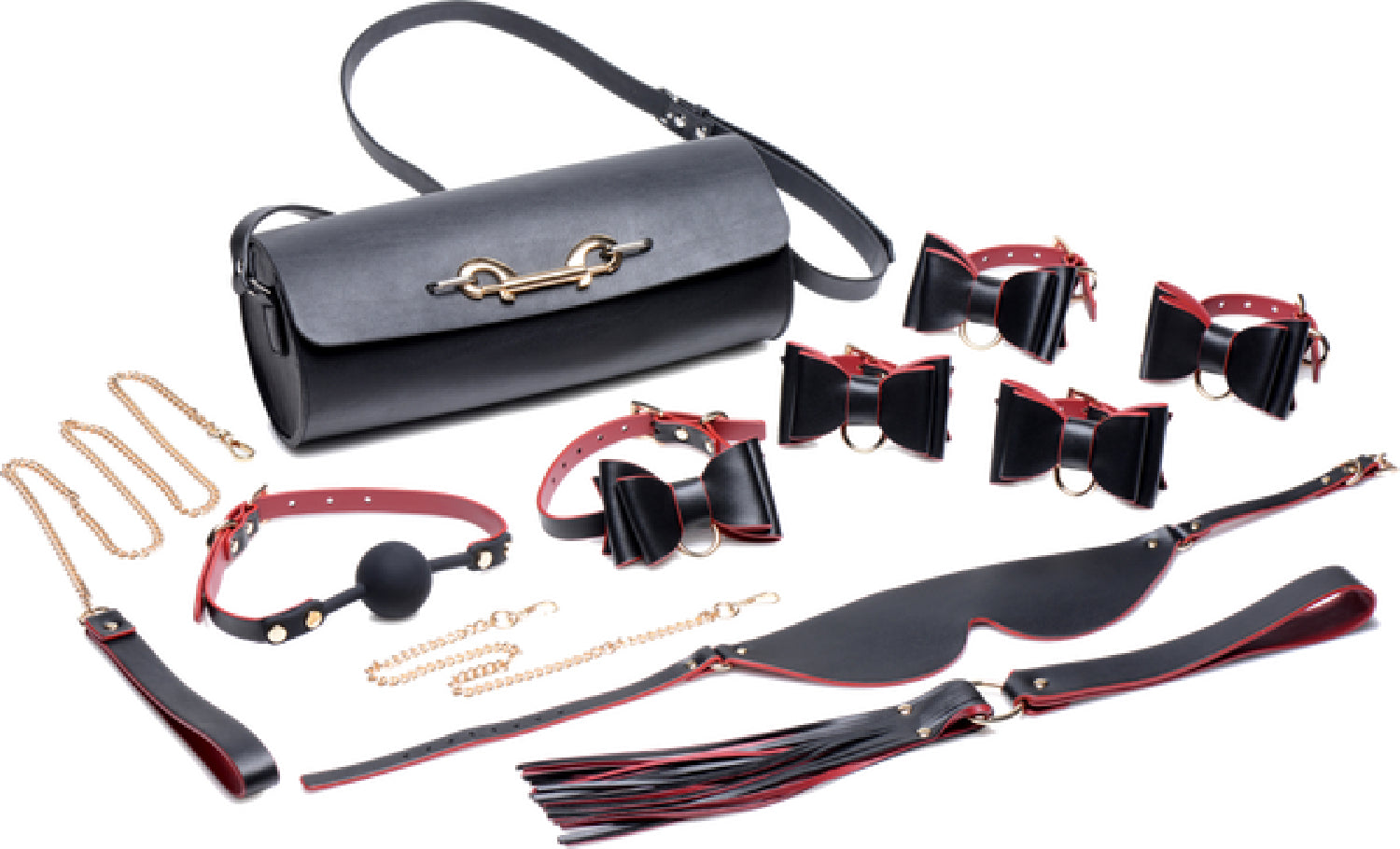 - Fully Stocked Kit: This bondage kit includes all the essentials needed for a kinky night out. Safely tucked away inside the bag are bow-tie ankle and wrist cuffs, bowtie collar, leash, ankle cuff chain, flogger, ball gag, blindfold and a cuff connector bar to securely clasp the bag shut.