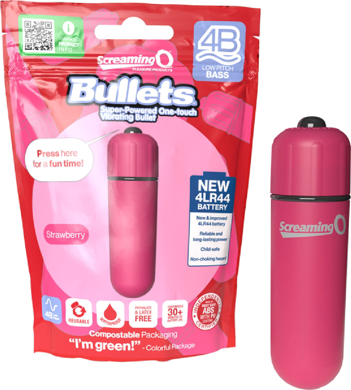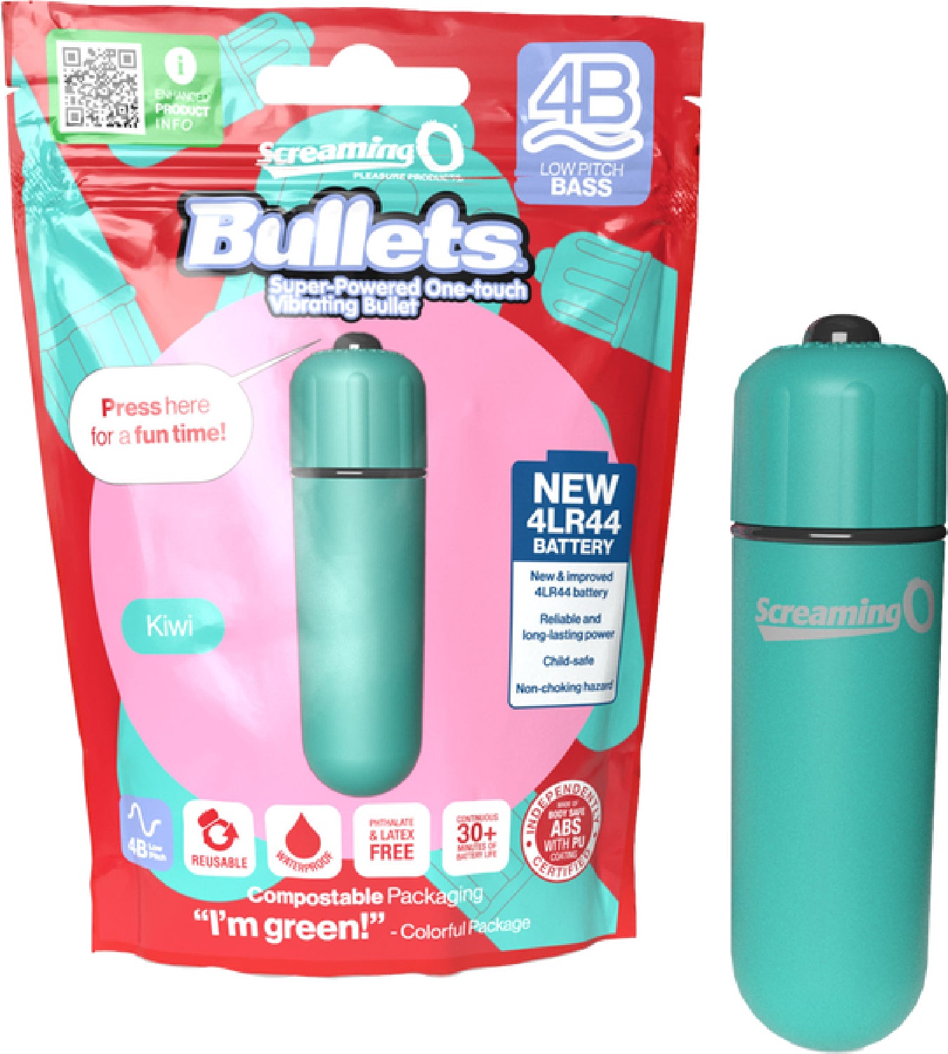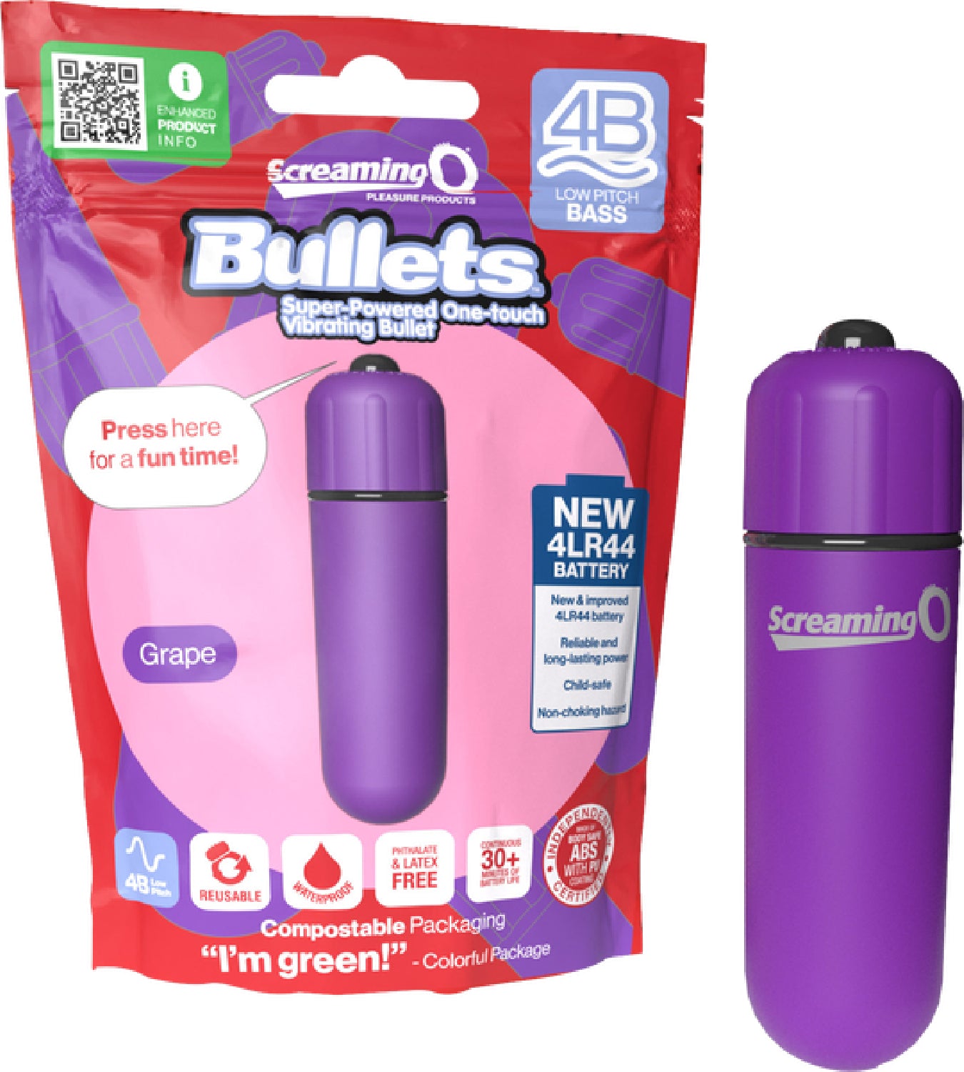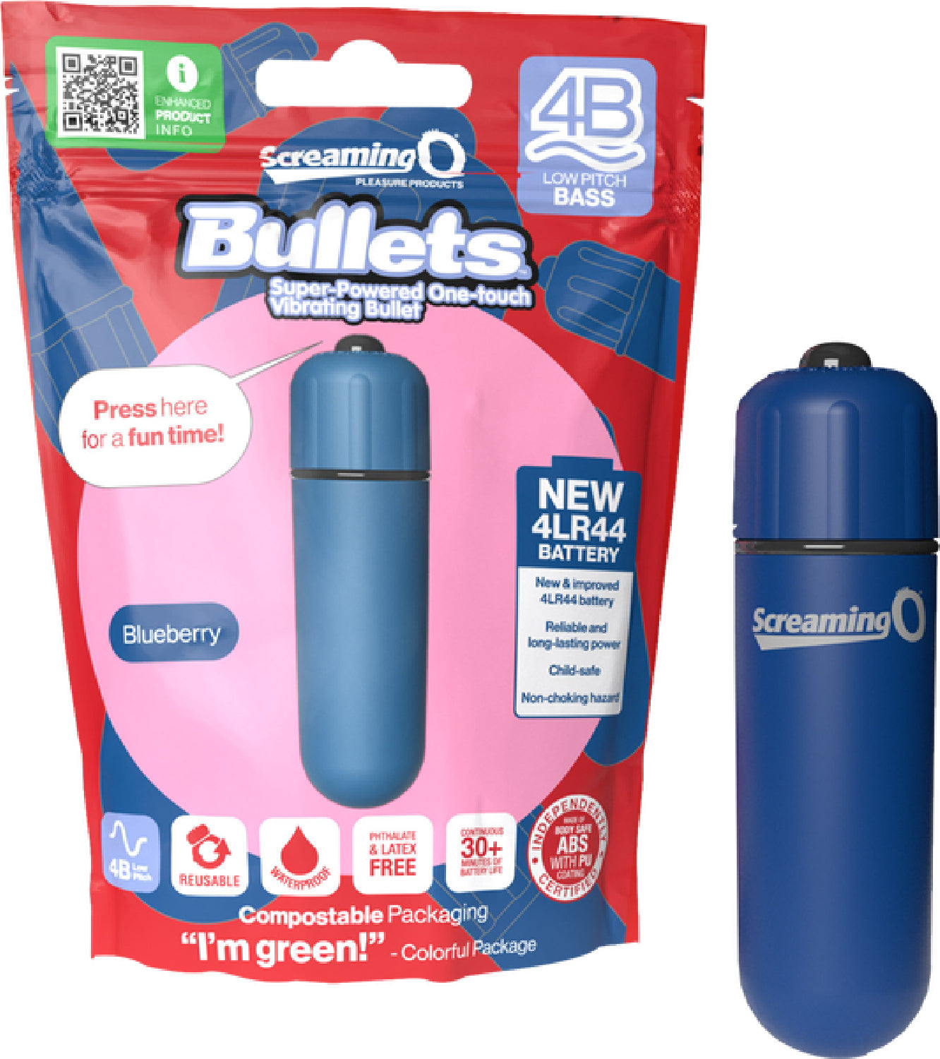 With their compact shape; powerful 4B motor creating bass style vibrations; new 4LR44 longer lasting batteries; and a remarkably smooth, silky feel, the Screaming O 4B Bullets provide deep stimulation for better, more satisfying sex!Following research into vibration frequency and optimal clitoral massage speeds, Screaming O developed a unique motor that provides deep, rumbling vibrations you can feel from the inside. Thanks to a waterproof soft-touch shell, you can enjoy smooth, gliding sensations in the bath or shower.These super-powered one-touch vibrating bullets are available in four colors and pack intense power in an on-the-go size that’s perfect when larger, bulkier vibes just won’t cut it. They add essential stimulation for better, more satisfying sex! In addition to promoting sexual health and wellbeing, Screaming O wants to put your mind at ease knowing that the Screaming O 4B Bullet is produced using materials and processes that are both ethical and sustainable. The bullet packaging is an eco-friendly zip pouch made from a combination of recyclable Kraft paper and biodegradable & compostable PLA. We have also switched to new 4LR44 batteries for our bullets. In addition to being more reliable and long-lasting for your pleasure, they are child-safe and require fewer units to power the products therefore adding less waste to the landfills.