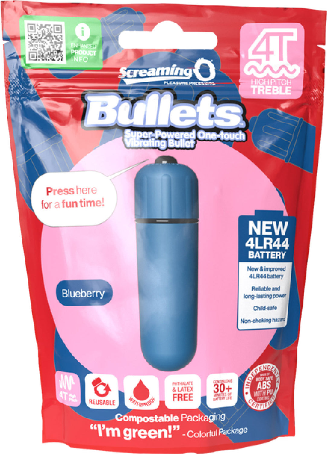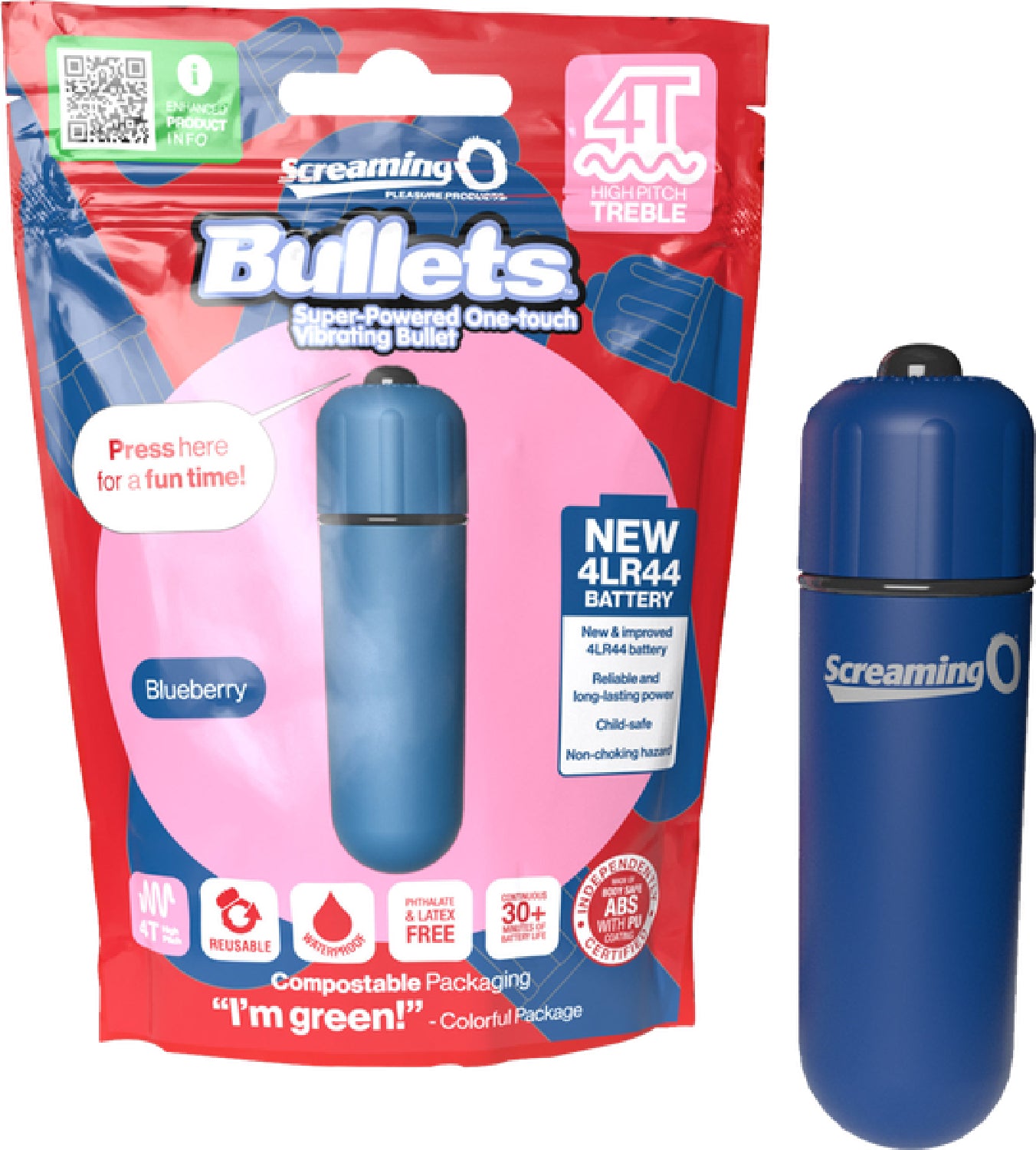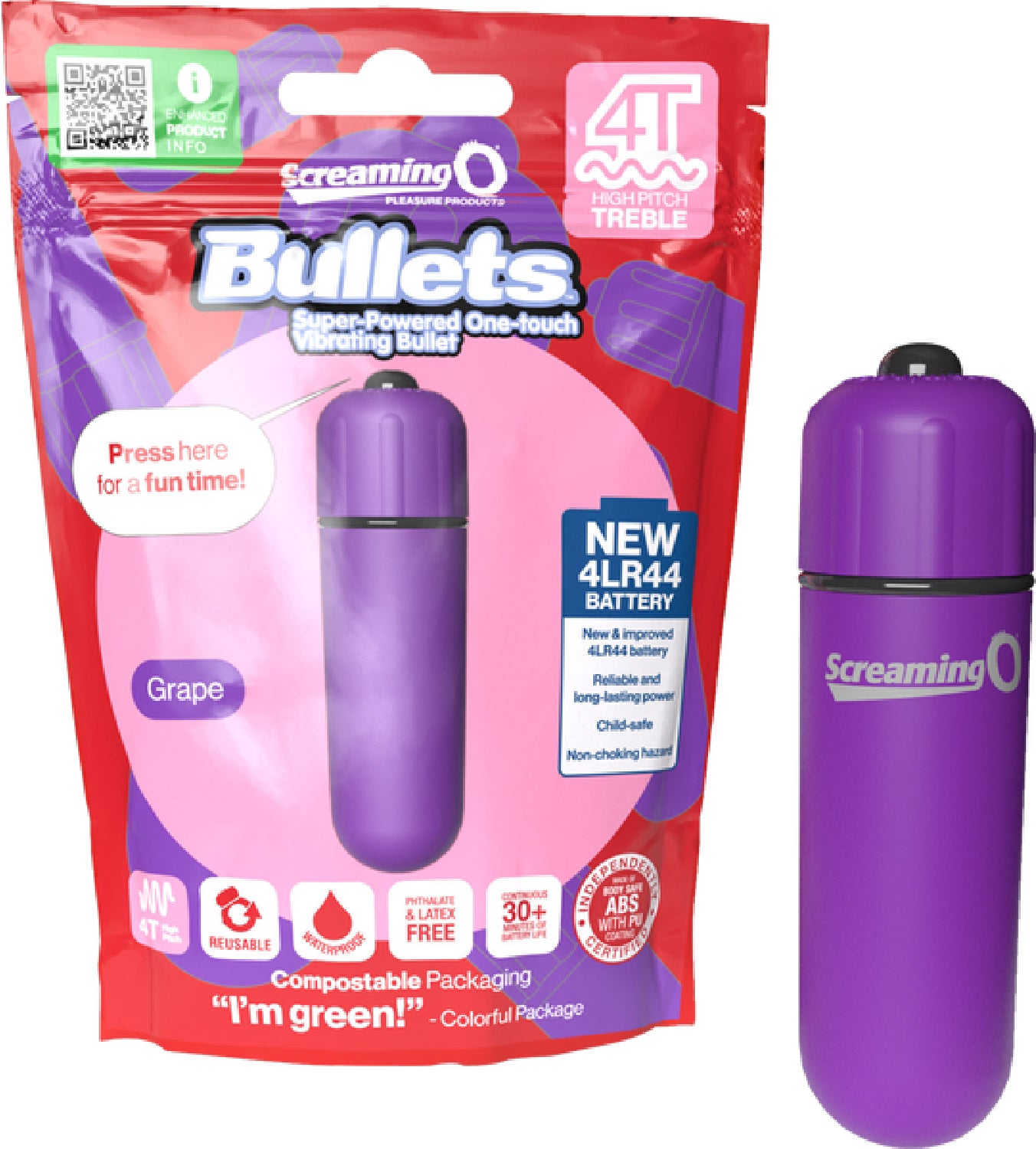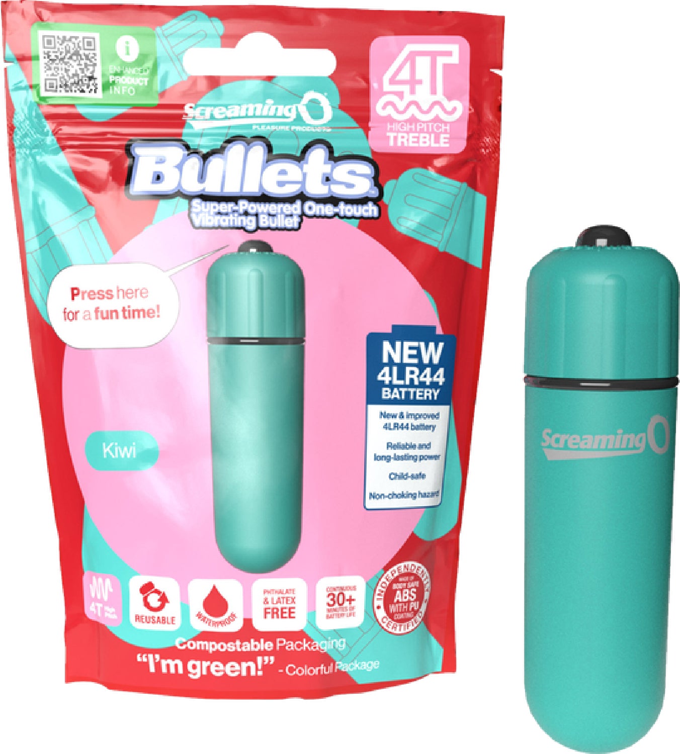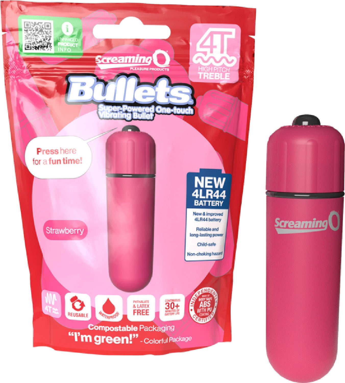 With their powerful 4T treble style vibrating motor; new 4LR44 longer lasting batteries; remarkably smooth, silky feel; and compact shape, the Screaming O 4T Bullets are the ultimate tease and tickle vibes! Waterproof and available in four colors, the one-touch vibrating bullets feature a powerful yet quiet motor, adding essential stimulation for better, more satisfying sex! With upgraded batteries, they provide intense power in an on-the-go size that’s perfect when larger, bulkier vibes just won’t cut it. In addition to promoting sexual health and wellbeing, Screaming O strongly believes in leaving this planet better off than we found it, which is why the Screaming O 4T Bullet is manufactured using materials and processes that are both ethical and sustainable. For example, the bullet packing is compostable and eco-friendly.