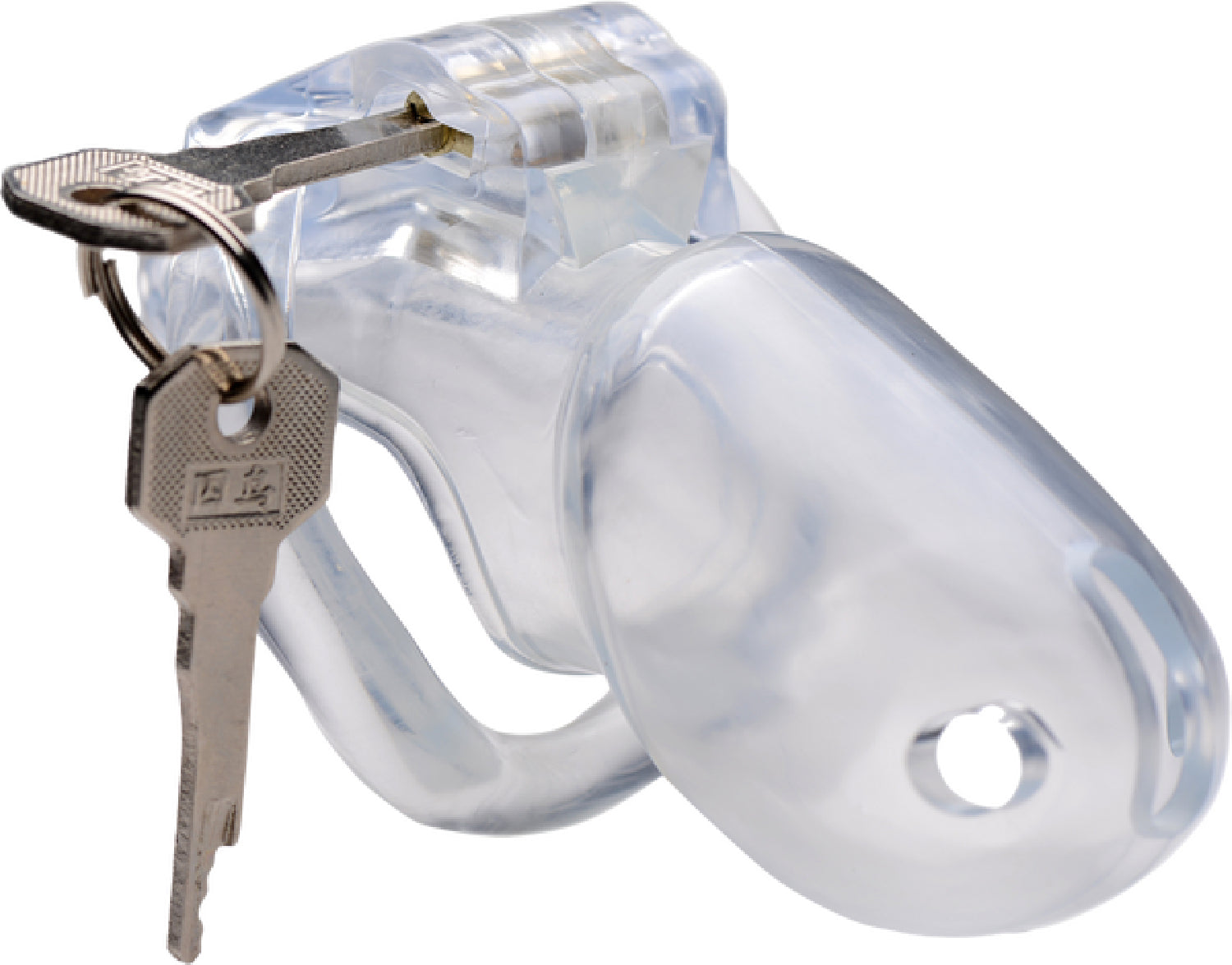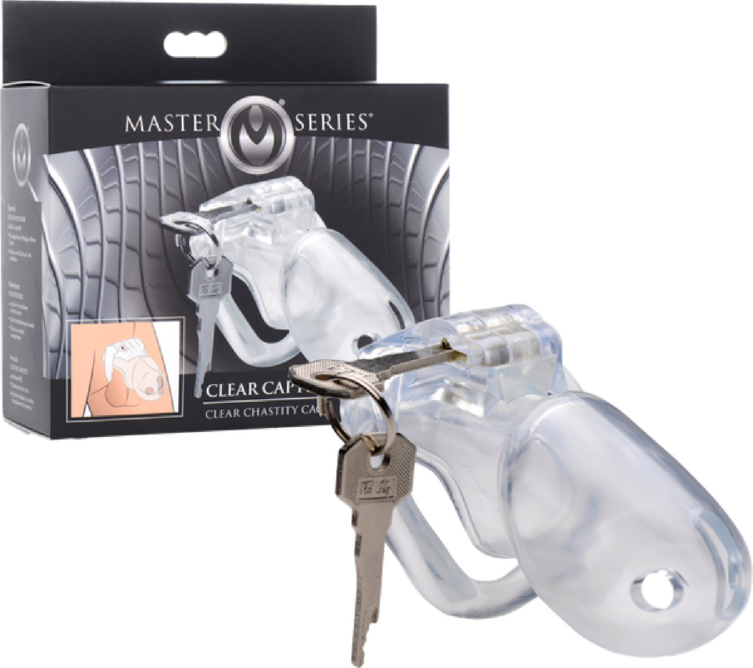 The secure locking mechanism secures this cage without pesky locks getting in the way! The Clear Captor includes two keys, one for you and the other for your sub in case of emergencies.