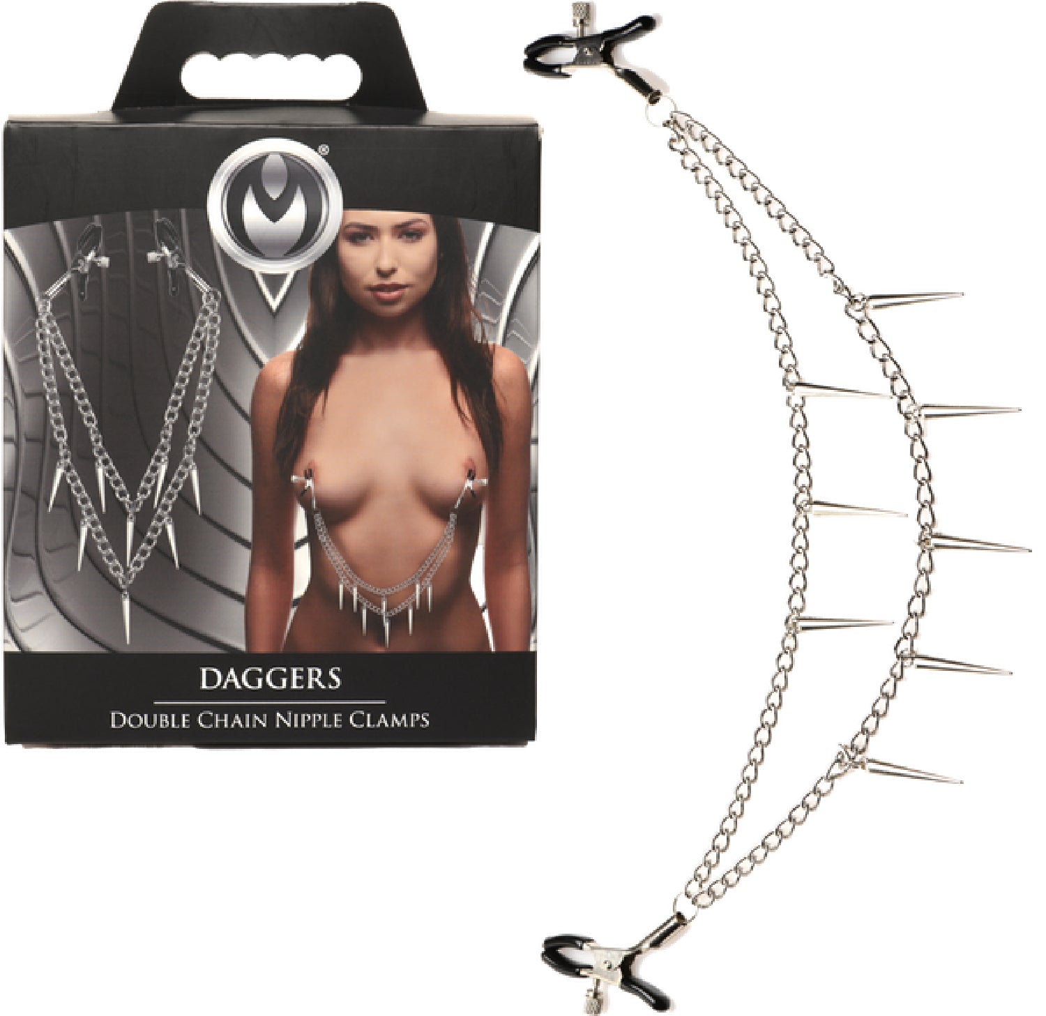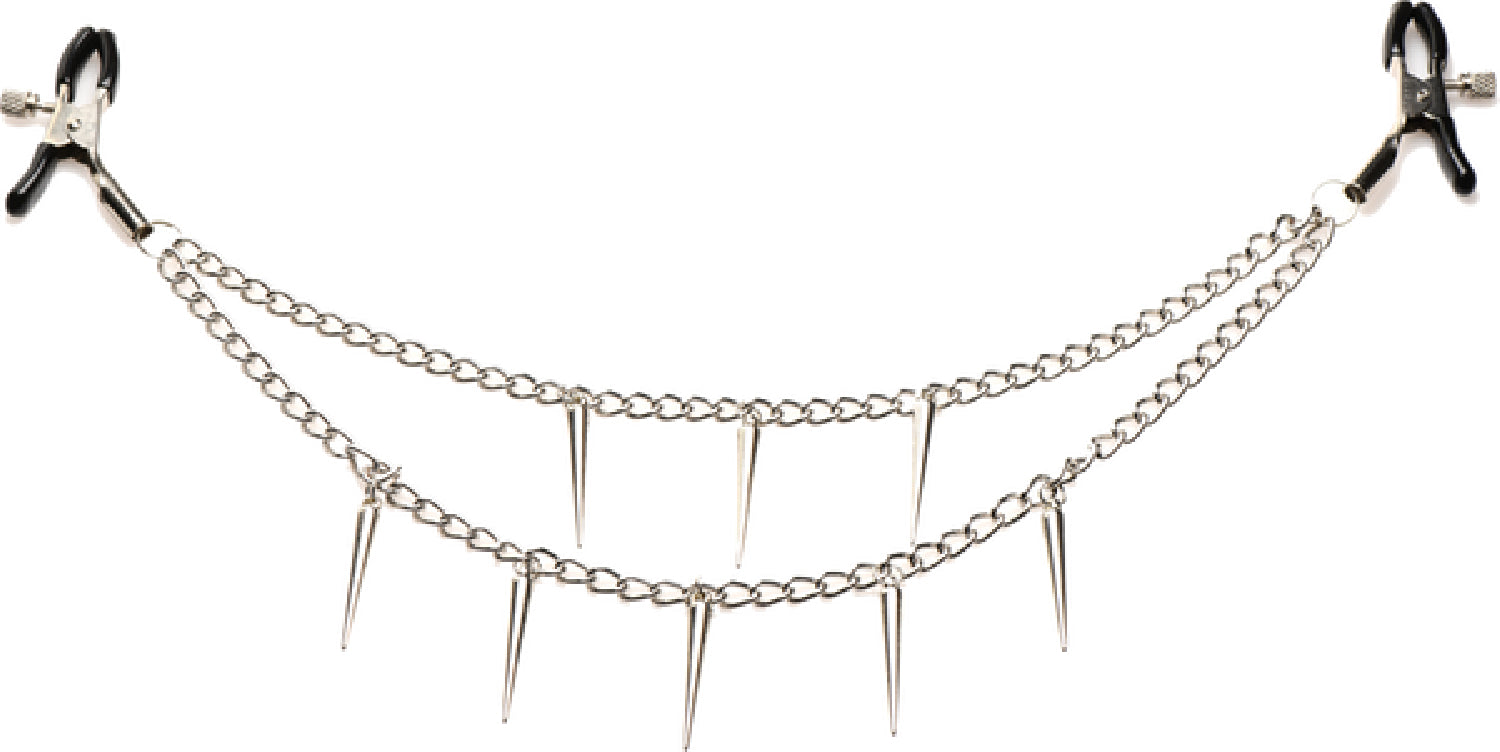 - Spiked Chain: Two rows of chain hang down between the nipples and have spikes dangling from them. Enjoy the aesthetic and look as well as the ability to gently tug at the clamps!