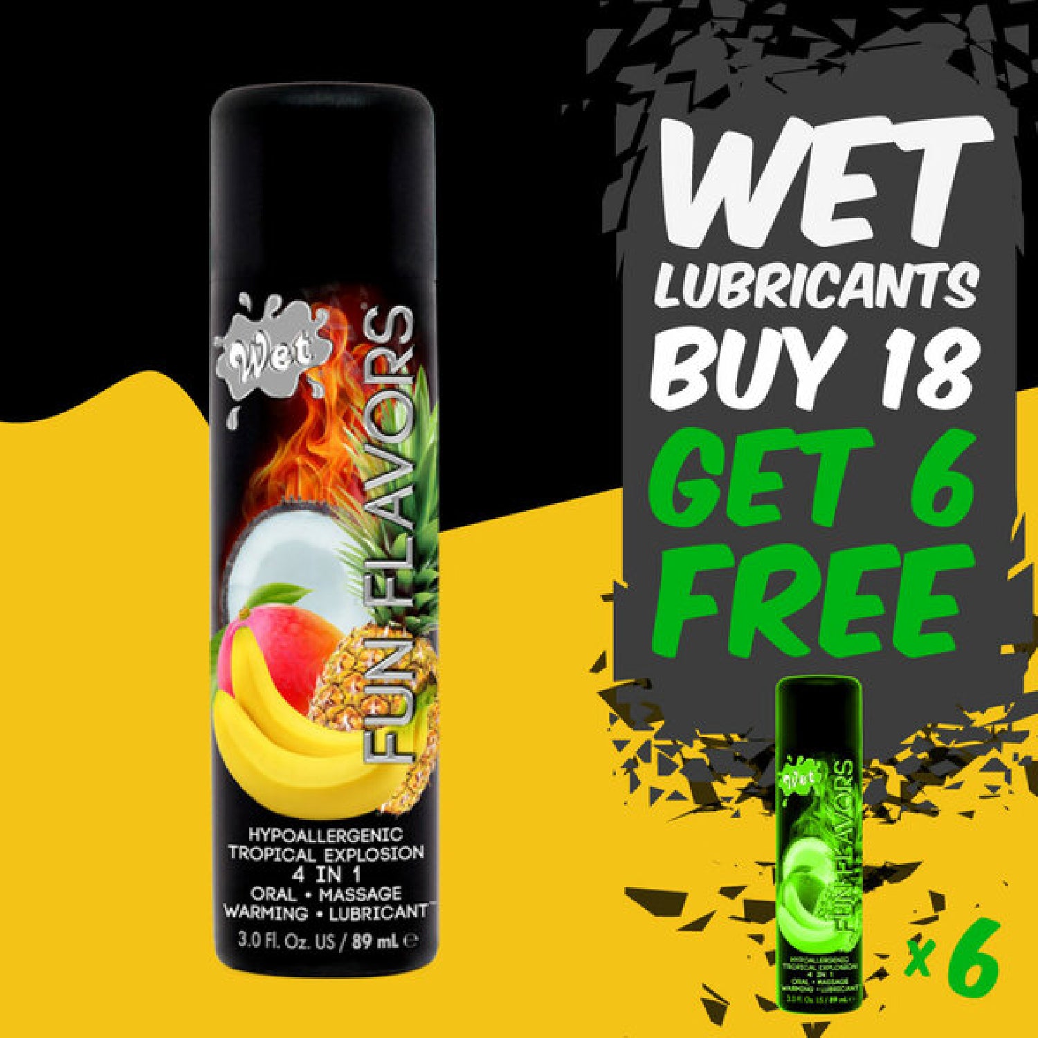 Turn up the heat with Wet® Fun Flavors® Warming Lubricants. These tasty formulas heat on contact and warms with motion … blow on them, and they get warmer, heightening sexual arousal. Lick them and discover the mouth-watering flavors of Juicy Watermelon, Tropical Explosion, Popp'n Cherry, Sexy Strawberry, or Passion Punch. Wet Fun Flavors make foreplay, oral, intercourse, and massage an exotic, flavorful union of euphoria.