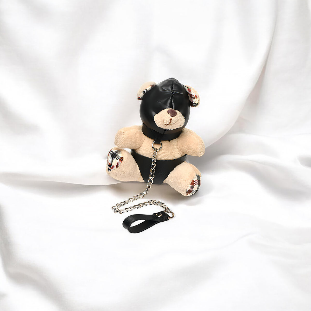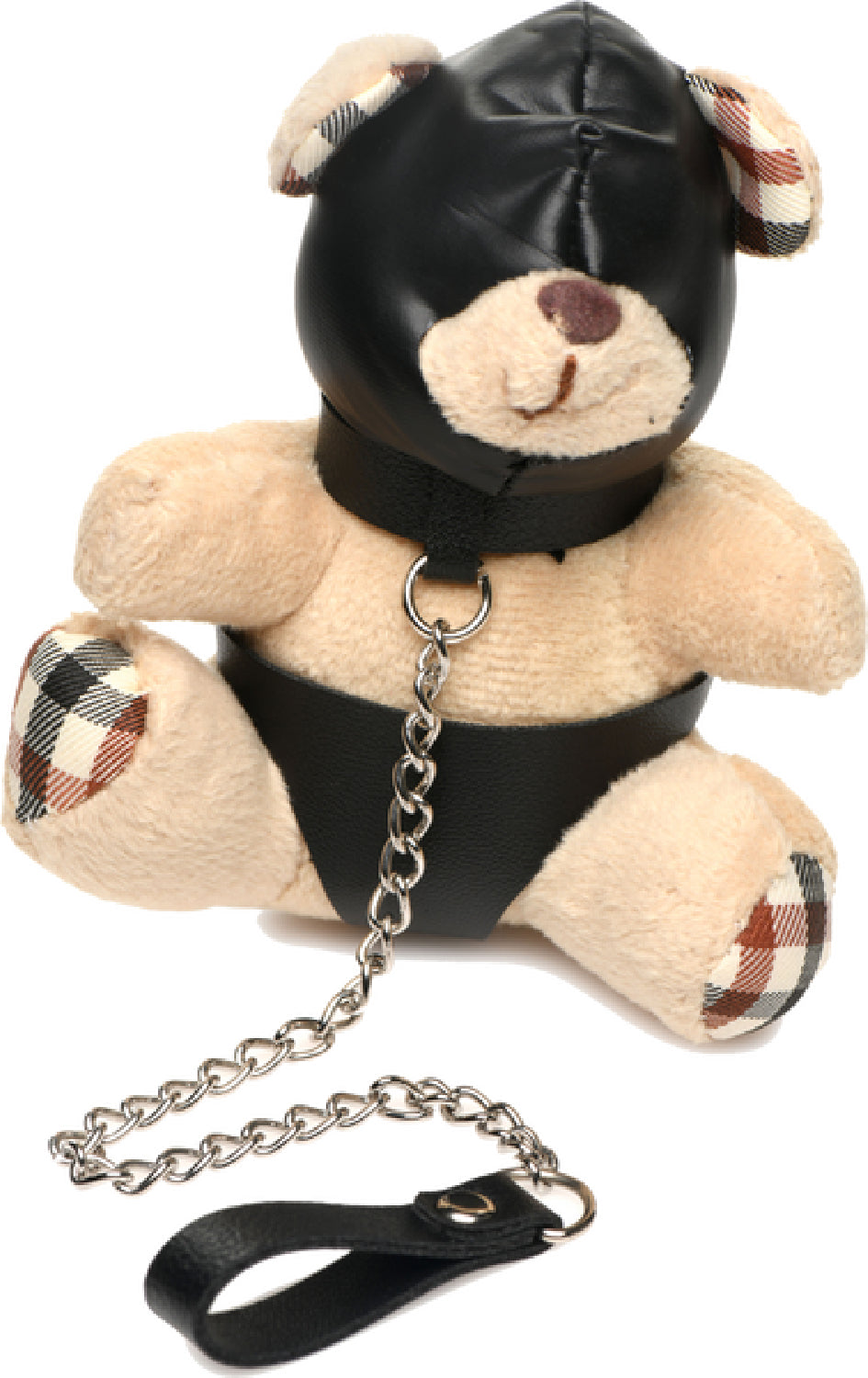 - Great Novelty Gift!!: This hooded bear makes a perfect little gimp for your amusement! Give it as a gift or keep it for yourself! Its little, peach bear body is dressed in PU leather underwear and a gimp mask, a chain leash connects to its collar.