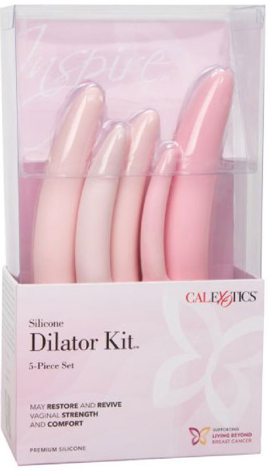 The 5-piece Inspire Silicone Dilator Kit is designed with your comfort in mind. The ergonomically curved tools are thoughtfully created to improve intimate experiences and to aid sexual health. Each piece is made from phthalate free, silky soft, pastel pink premium silicone, and range in size for comfortable, gradual dilation. Each dilator has a smooth and sleek angled shape, and a finger loop for easy use. Insertion of the dilators restores and revives vaginal strength and can also be beneficial in easing discomfort. For a comfortable application, it is recommended that you use a quality lubricant. The Inspire Silicone Dilator Kit can be used as a vaginal trainer, or for treating vaginismus. By using a vaginal dilator set, at home, you can train your vaginal muscles to relax and become used to penetration. The dilators are also suitable for recovery use after surgery.