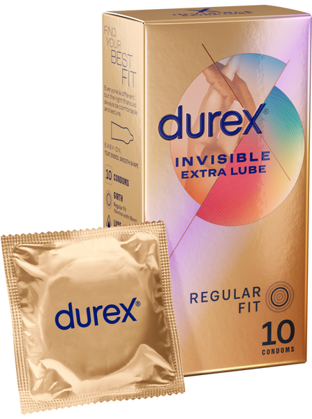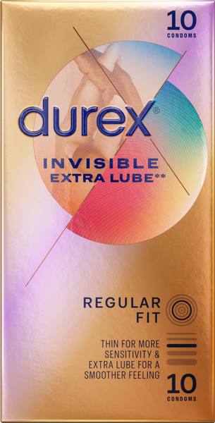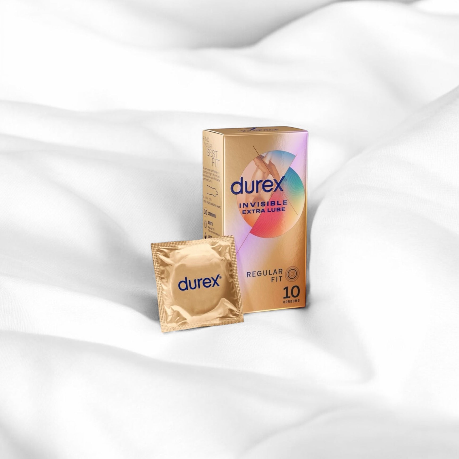 Durex Invisible Extra Lube condoms are thin with extra lubrication for a smoother feeling.