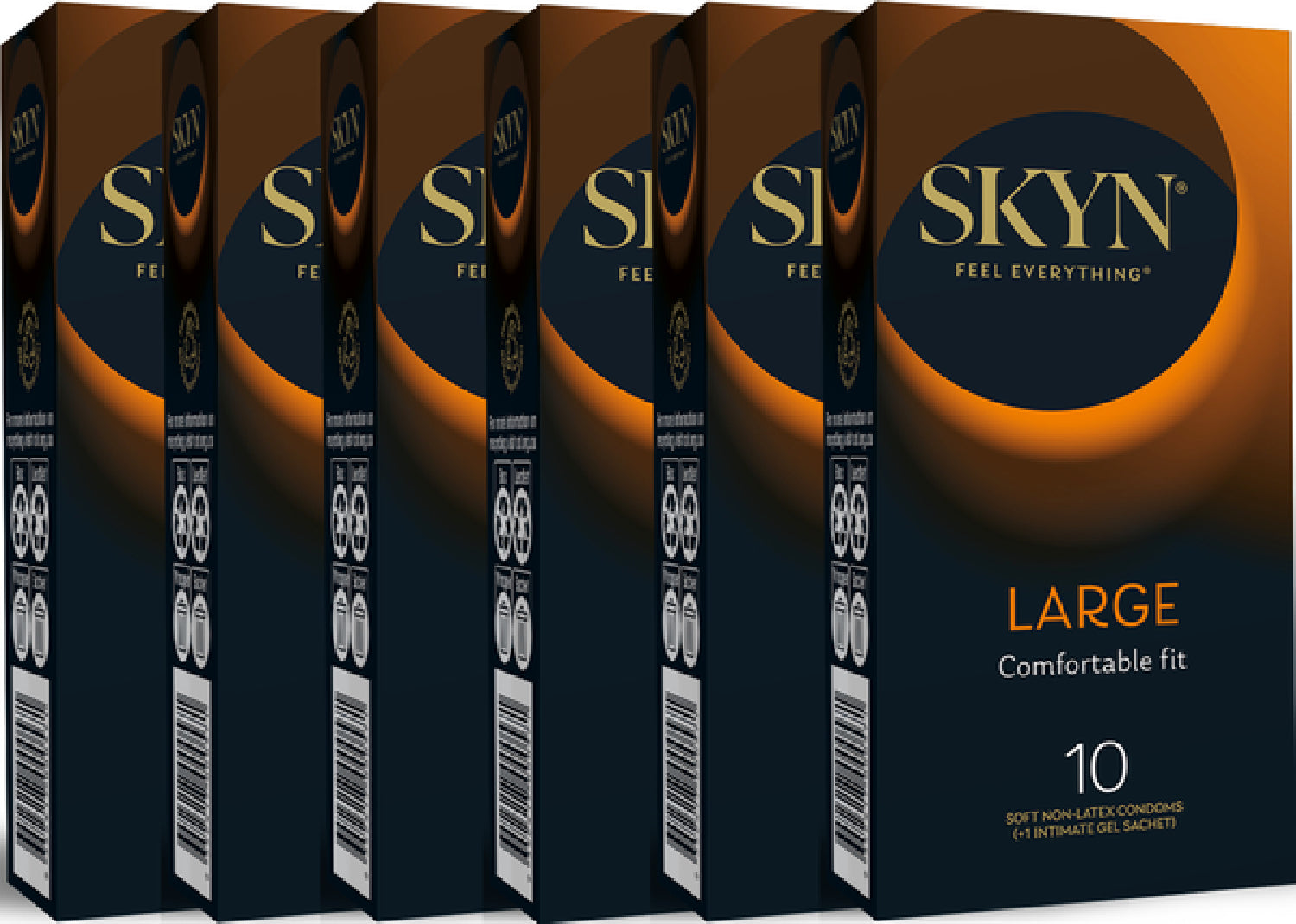 Larger and longer than our standard condoms for extra comfort. SKYN condoms are made from a soft, natural feeling material called polyisoprene. Experience SKYN®, the closest thing to wearing nothing™. 97% of people who try SKYN® recommend them.*