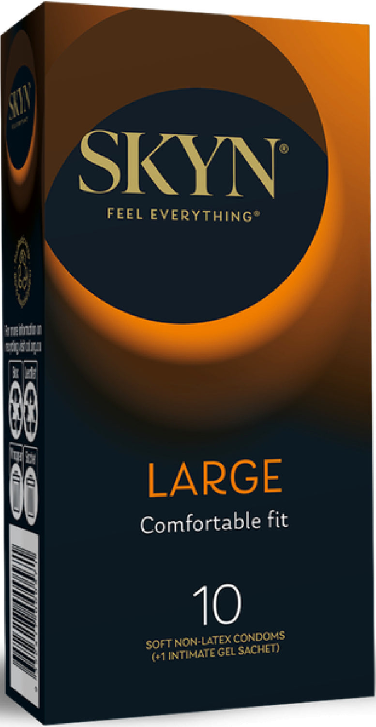 Larger and longer than our standard condoms for extra comfort. SKYN condoms are made from a soft, natural feeling material called polyisoprene. Experience SKYN®, the closest thing to wearing nothing™. 97% of people who try SKYN® recommend them.*