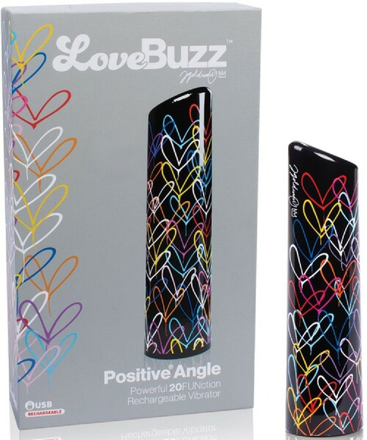 Enjoy positive vibes with renowned artist JGoldcrown’s LoveBuzz Positive Angle, a 100% waterproof rechargeable massager that features his trademark #lovewall artwork. This sleek and sexy vibe includes a unique low-pitch motor and wide angled vibration surface designed for a dramatically different pleasure experience. The LoveBuzz Positive Angle is equipped with 20 functions of deep, rumbling, penetrating vibration that satisfies even the most seasoned sex toy aficionado. It’s angled tip and wide surface makes it easy to pinpoint pleasure with precision. At its highest speed, the LoveBuzz Positive Angle vibrates for more than 60 minutes and powers back up with a convenient USB connector that plugs in securely and stays put for the duration of the charge – hassle-free charging at its finest! LoveBuzz Positive Angle works with or without a remote control so you can enjoy pleasuring yourself solo or in partner play. This exclusive vibe is made of lab-tested, body-safe ABS plastic that glides across your skin. It comes with a 2-year limited warranty for technology you can trust.