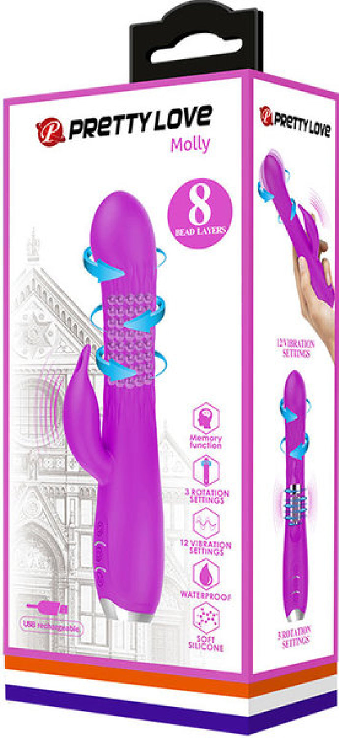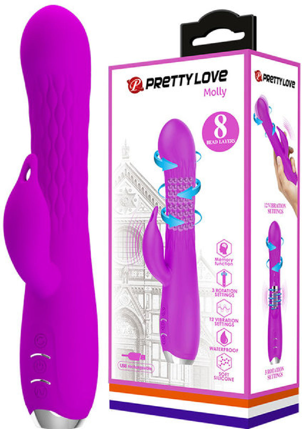 The Pretty Love Rechargeable Molly is a classic rabbit vibrator with a purple color that is sure to please. Made from high-quality, flexible, and smooth silicone, this vibrator is designed to fit your body's contours for maximum comfort and pleasure. The slightly realistic shape features a defined tip and a ribbed texture on the rotation shaft to provide added stimulation. The rabbit clit stimulator adds even more pleasure to your experience.