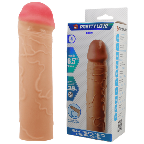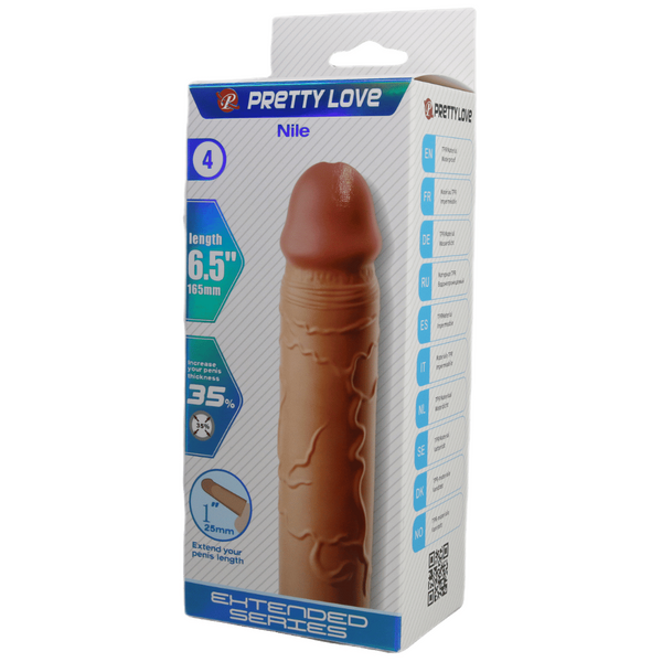 Go that extra inch to pleasure your partner when you pop on this erection-extending penis sleeve. Offering an extra inch in length, and a girth growth, its real-feel material and lifelike detailing create a realistically filling feeling. Designed to sit snugly on the wearer's penis, improve your hold and delay ejaculation, the smooth internal canal keeps play comfortable and pleasurable. Just don't forget to coat both the inside and outside of the toy with water-based lube before use.