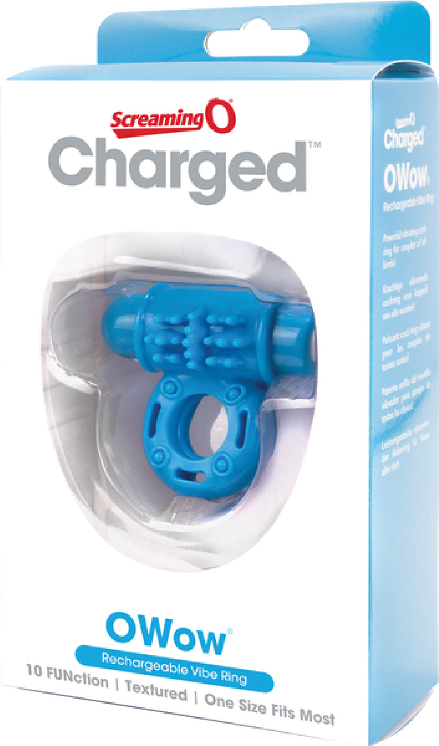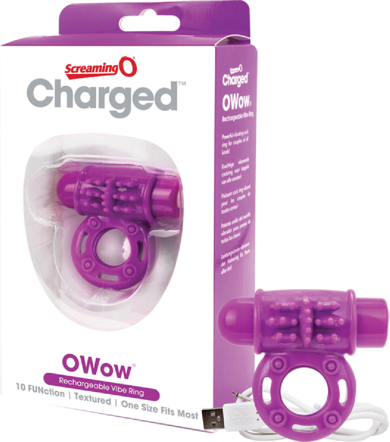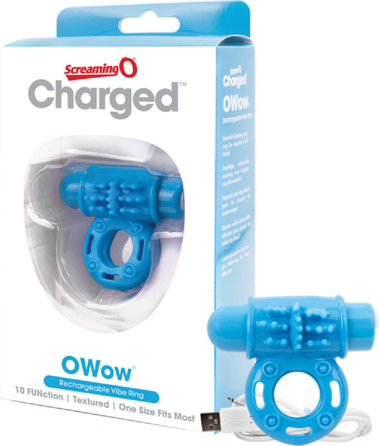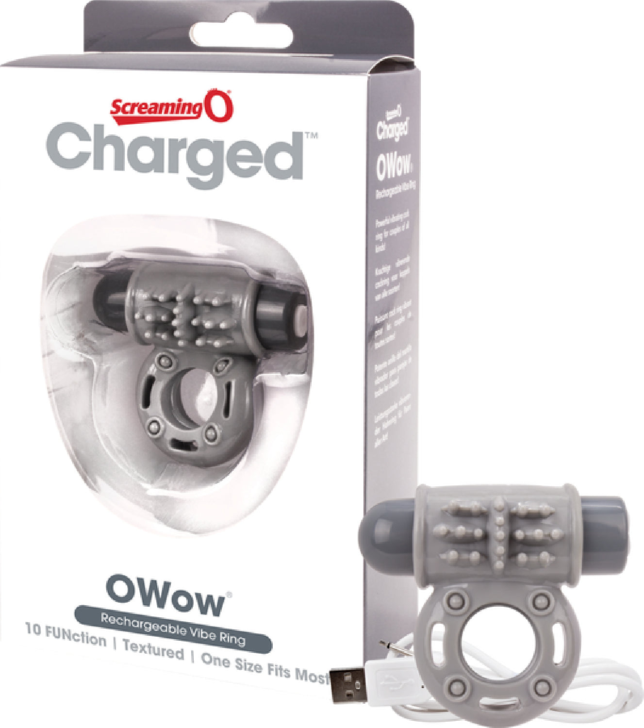 o enjoy, simply stretch the ring around the base of the penis or penis and testicles (his choice!) and adjust the motor as you like it: wear it on top for rumbling clitoral massage or wear it underneath the penis and testicles for pleasant pressure with added vibration. However you choose to enjoy it, the Charged OWow is easily powered up with a USB charge cable (included) for a 60+ minute vibration time and is completely waterproof – so you can take your new favorite couples toy into the bath or shower! And with a 2-year limited warranty, you can enjoy Charged OWow with confidence and get the most our of your pleasure experience.