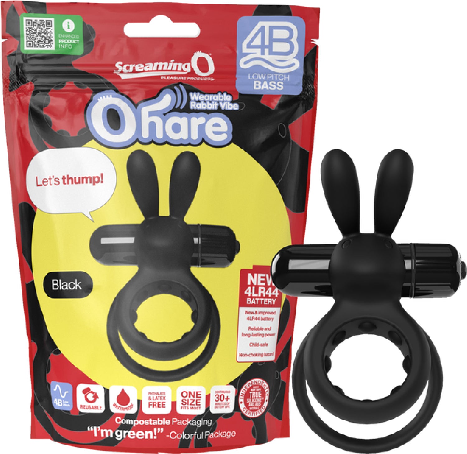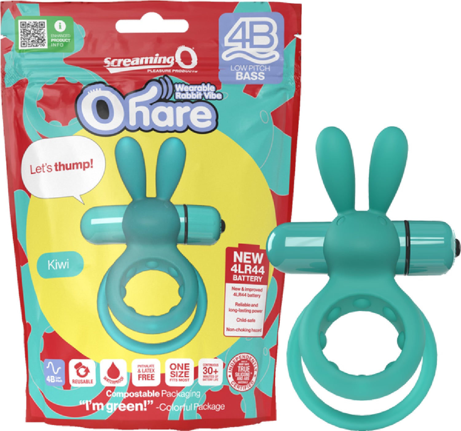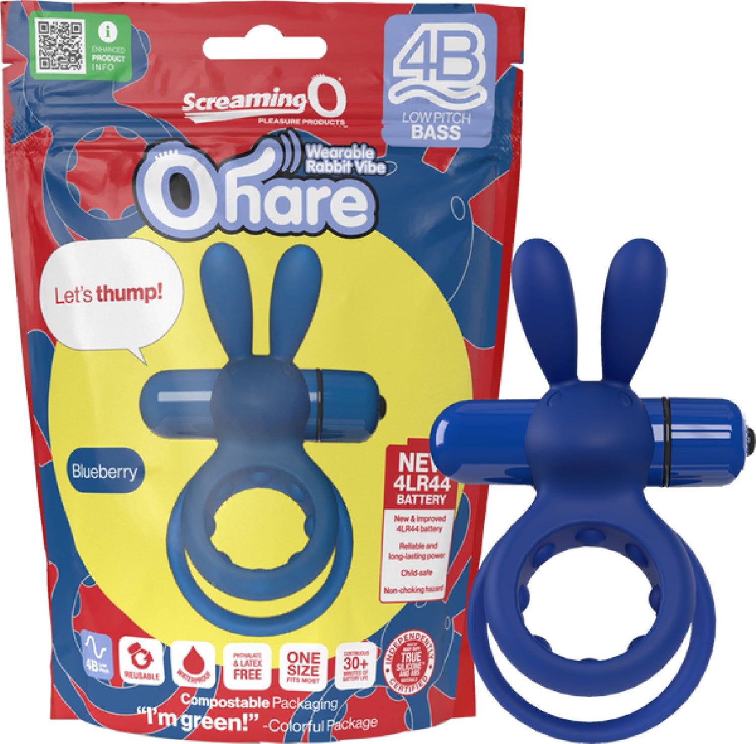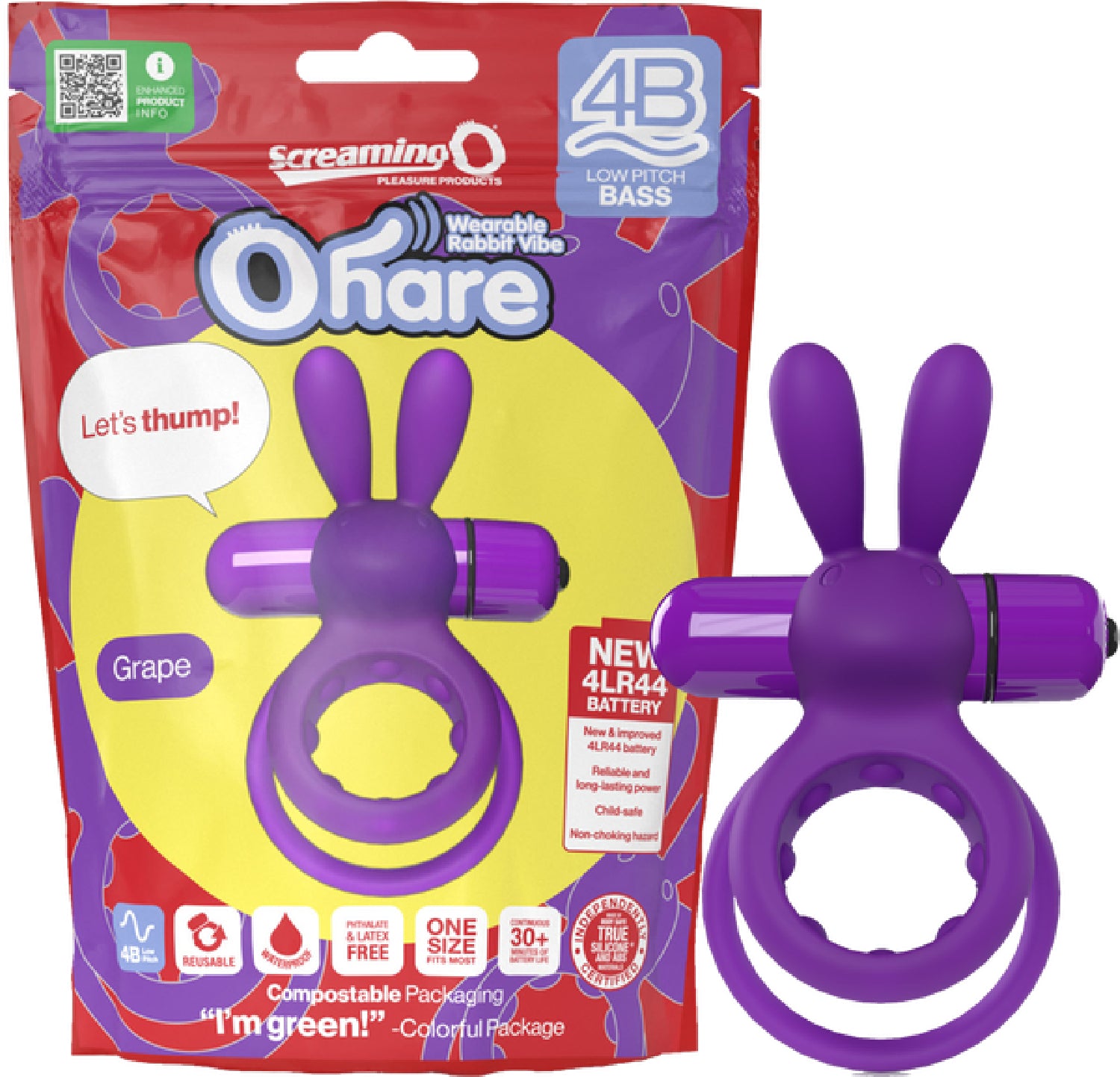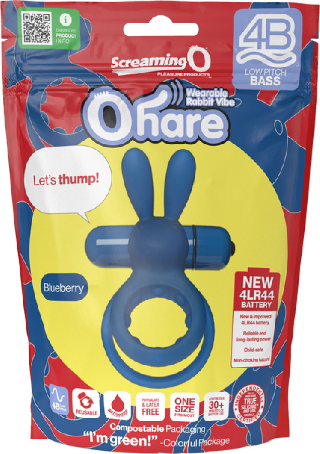 Hop on Screaming O’s 4B Ohare! It is sure to turn whatever shaft you are wearing it on into your favorite rabbit vibe. The body-safe, True Silicone® double rings are stretchy and reinforced for a snug yet comfortable fit. The rear ring stabilizes, providing targeted stimulation while the soft, flexible rabbit ears effectively transfer the deep, rumbling bass vibrations, assuring to excite and delight.Screaming O 4B Ohare was manufactured using materials and processes that are both ethical and sustainable. Because in addition to promoting sexual health and wellbeing, Screaming O strongly believe in leaving this planet better off than we found it. For example, the 4B Ohare packaging is compostable, eco-friendly packaging made from a combination of recyclable Kraft paper and biodegradable & compostable PLA.Additionally, new 4LR44 batteries are being implemented for the bullets. Not only are these batteries more reliable and longer lasting for your pleasure, they are also child-safe and require fewer units to power the products therefore adding less waste to the landfills.