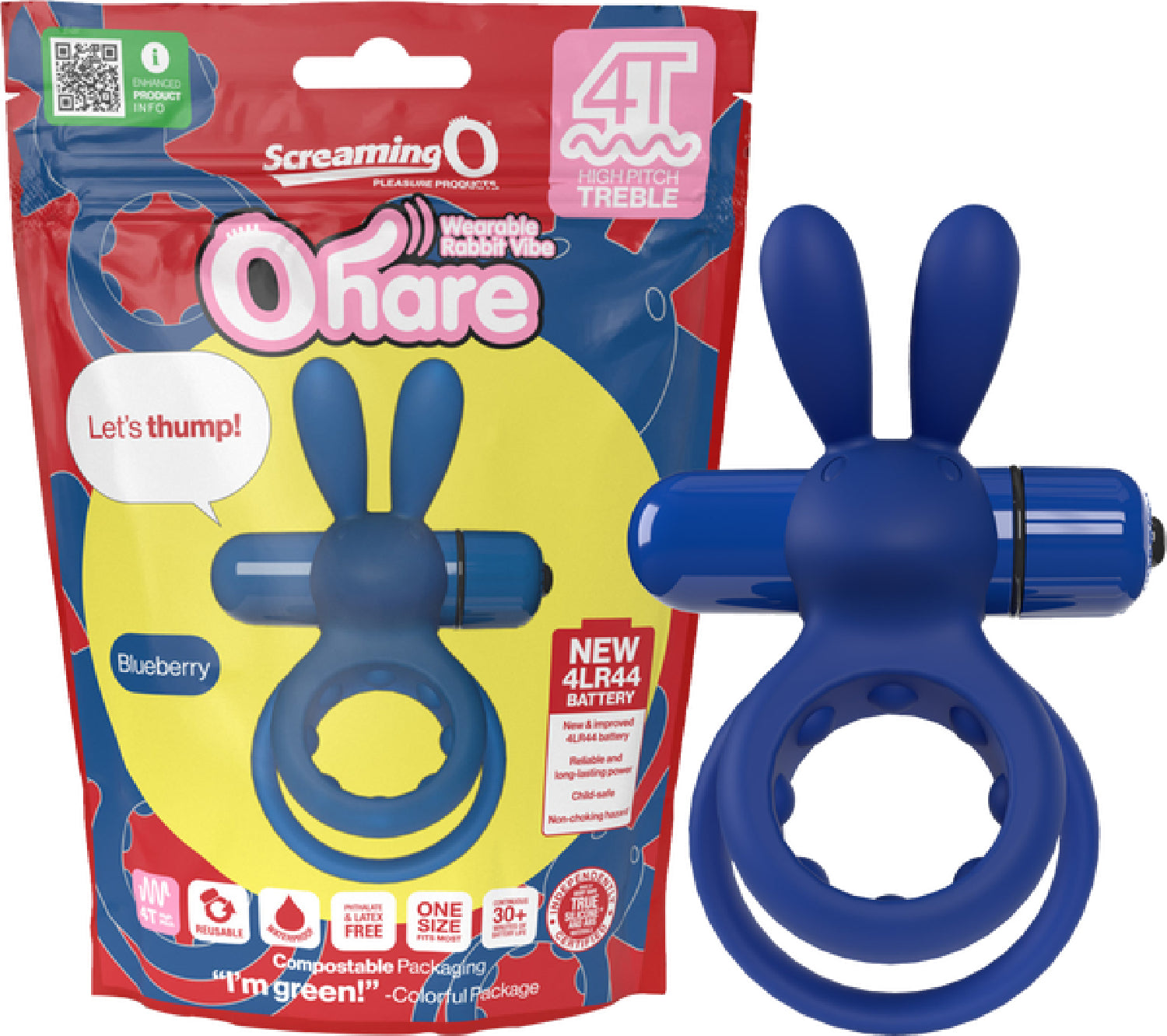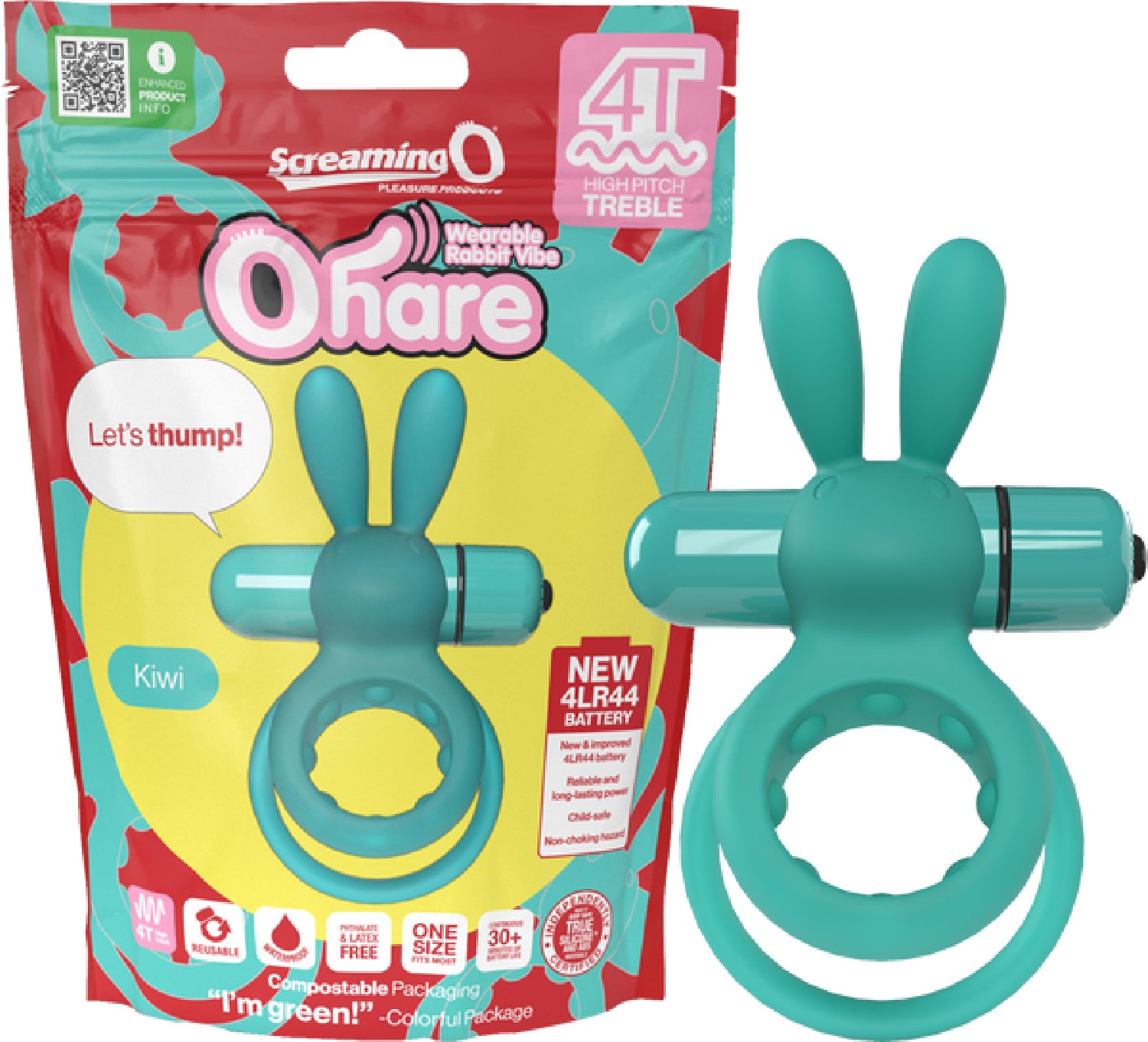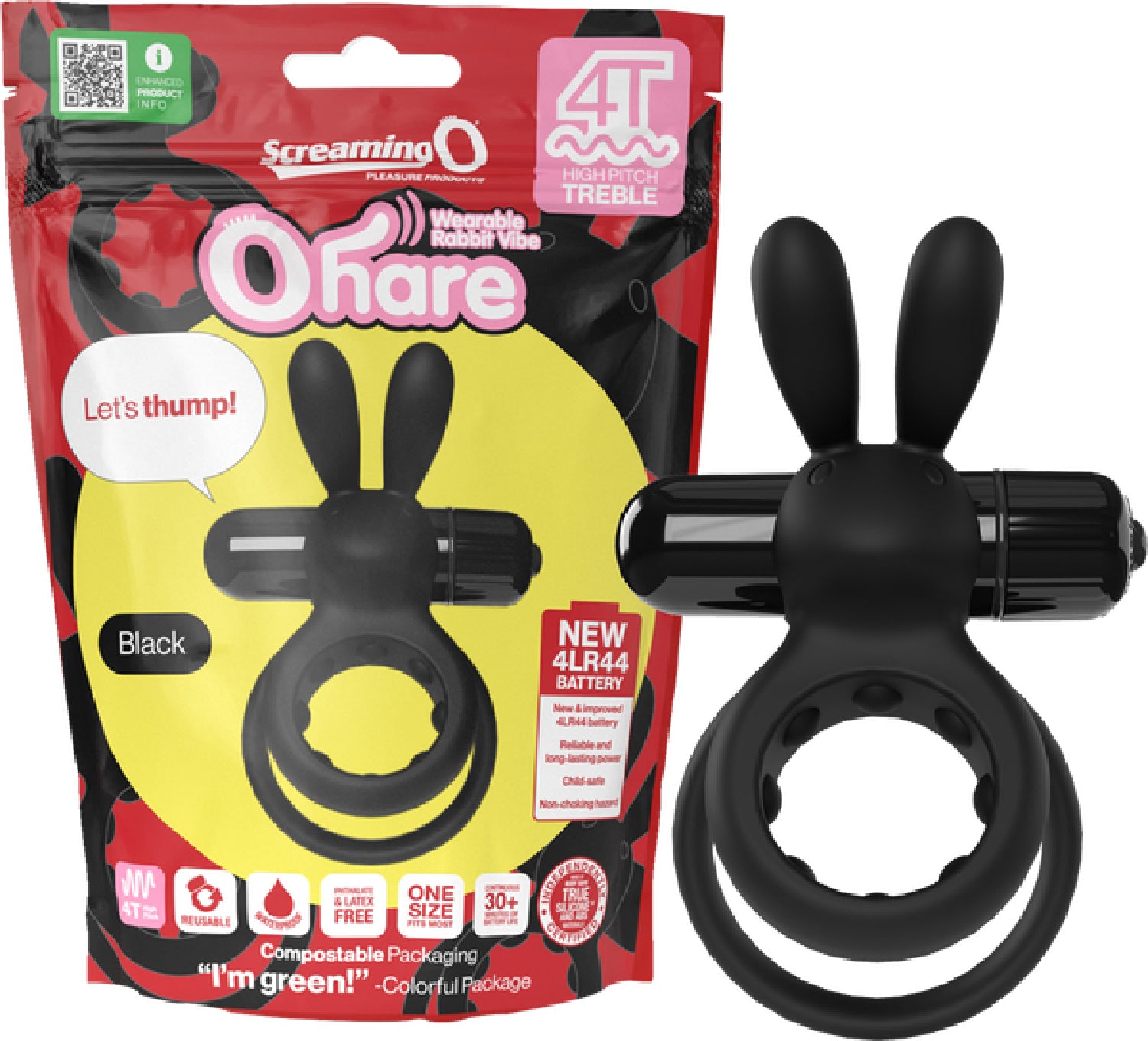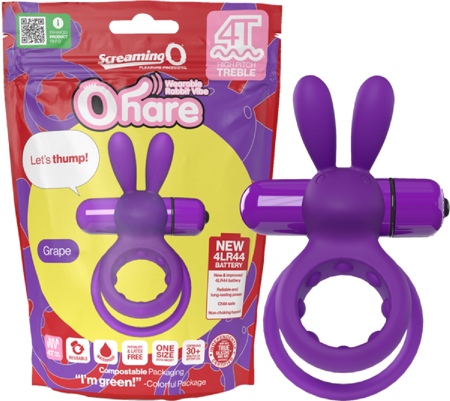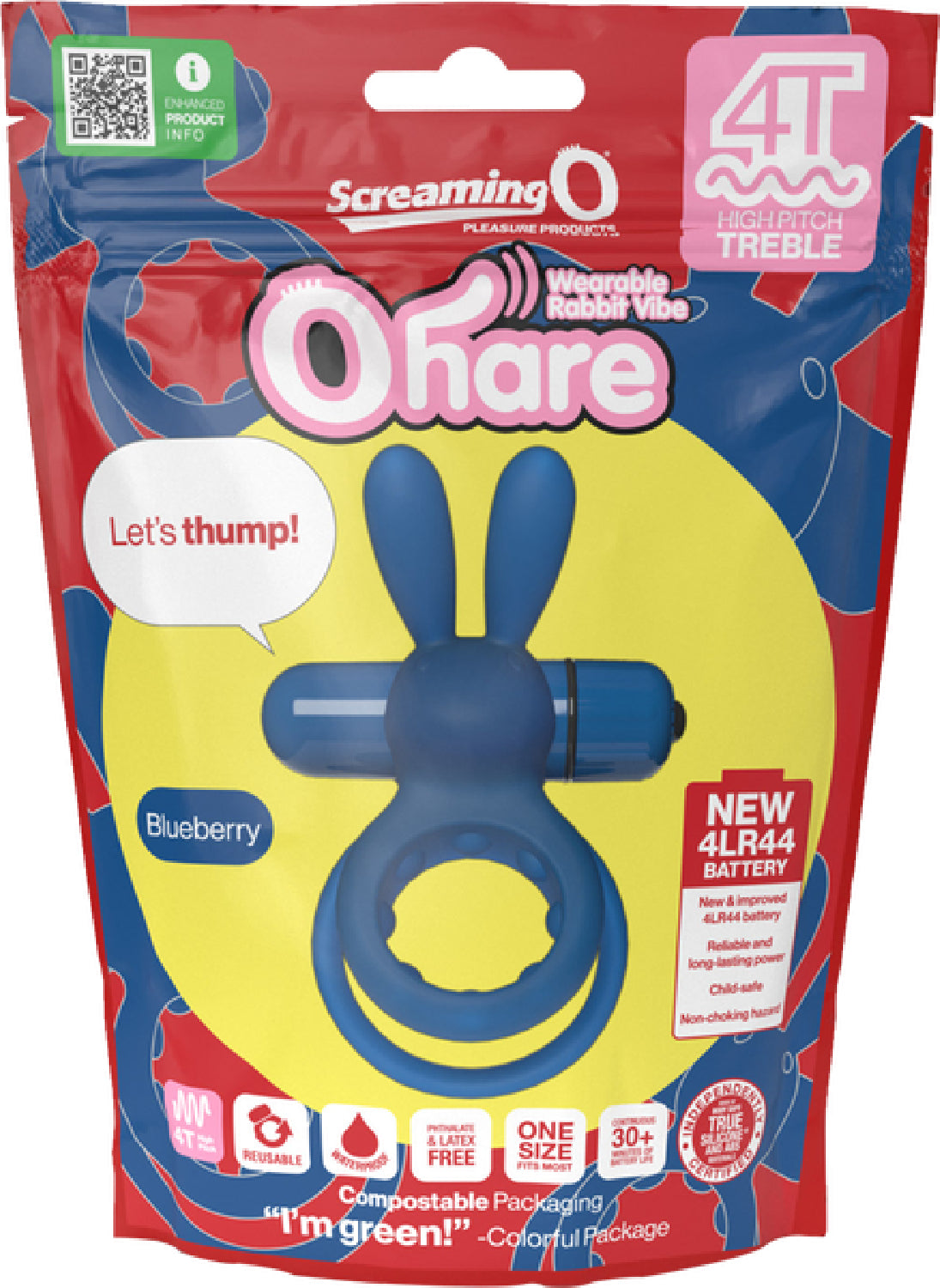 Hop on Screaming O’s 4T Ohare! It is sure to turn whatever shaft you are wearing it on into your favorite rabbit vibe. The body-safe, True Silicone® double rings are stretchy and reinforced for a snug yet comfortable fit. The rear ring stabilizes, providing targeted stimulation while the soft, flexible rabbit ears effectively transfer the treble style vibrations, assuring to excite and delight.Screaming O 4T Ohare was manufactured using materials and processes that are both ethical and sustainable. Because in addition to promoting sexual health and wellbeing, Screaming O strongly believe in leaving this planet better off than we found it. For example, the 4T packaging is compostable, eco-friendly packaging made from a combination of recyclable Kraft paper and biodegradable & compostable PLA.Additionally, new 4LR44 batteries are being implemented for the bullets. Not only are these batteries more reliable and longer lasting for your pleasure, but they are also child-safe and require fewer units to power the products therefore adding less waste to the landfills.