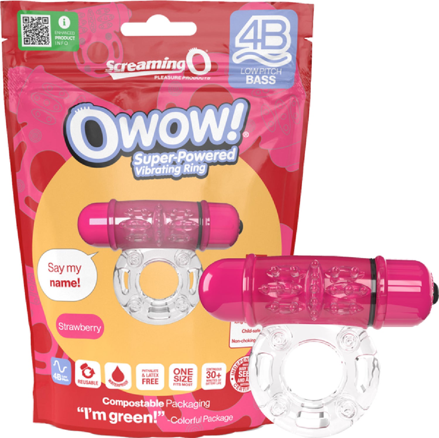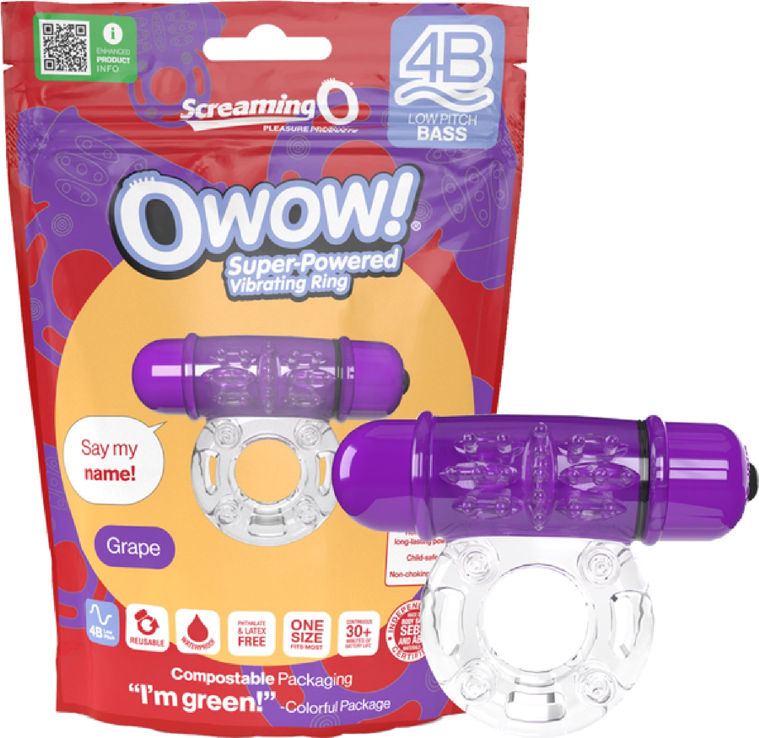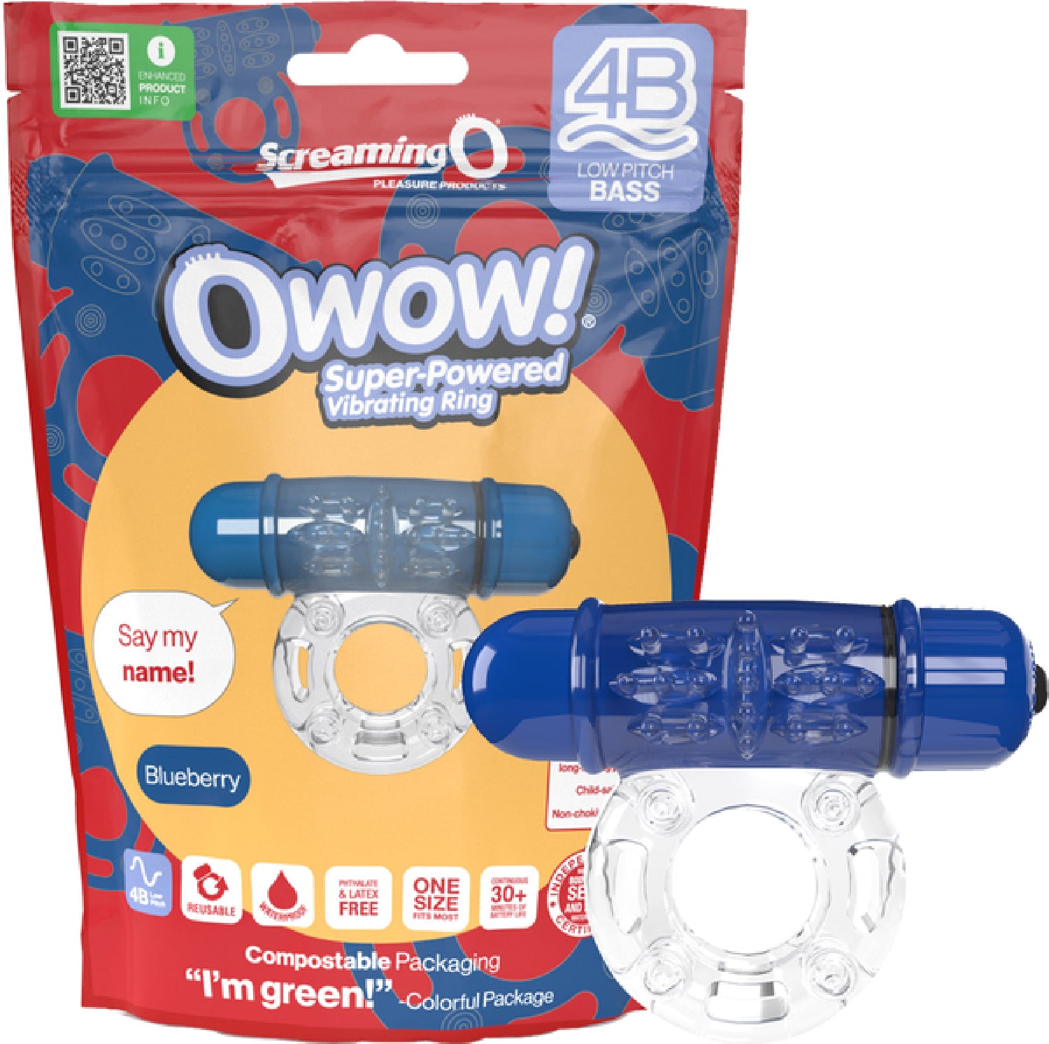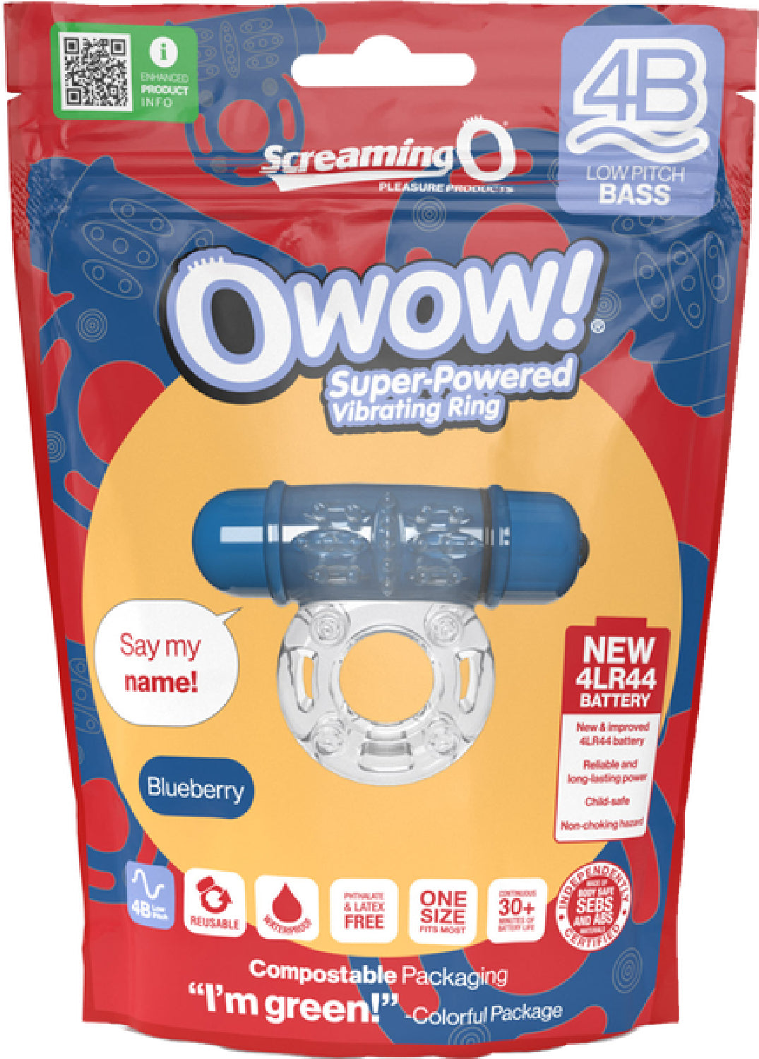 The Screaming O 4B OWow vibrating ring features a super-powered 4B bullet with deep, rumbling bass vibrations to provide powerful and mutual pleasure enhancements for couples of all kinds. Made of lab-tested body-safe SEBS, the stretchy ring is designed to fit comfortably. It is available in four colors to suit your sensual mood. With extended pleasure ticklers for enhanced sensations, the Screaming O 4B OWow is sure to Make Love More Fun™. The 4B OWow is packaged using materials that are ethical, sustainable, and eco-friendly. Additionally, is it utilizing new 4LR44 batteries that are child-safe, more reliable, and longer lasting. Screaming O believes in leaving this planet better off than we found it, which is why promoting positive sexual as well as environmental health is important to us.