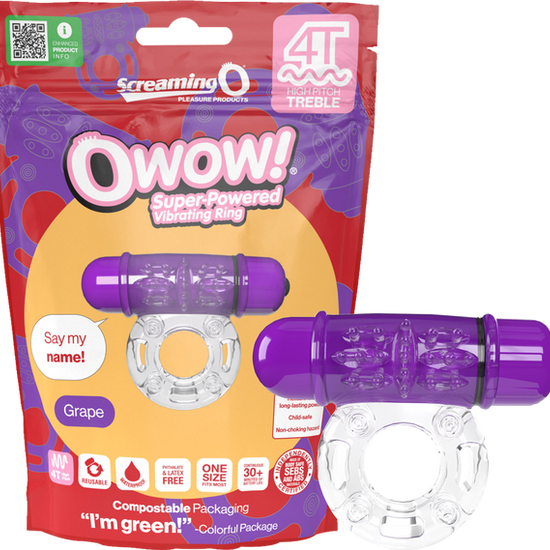 The Screaming O 4T OWow vibrating ring features a super-powered 4T bullet with treble style tickle and tease vibrations to provide powerful and mutual pleasure enhancements for couples of all kinds. Made of lab-tested body-safe SEBS, the stretchy ring is designed to fit comfortably. It is available in four colors to suit your sensual mood. With extended pleasure ticklers for enhanced sensations, the Screaming O 4T OWow is sure to Make Love More Fun™. The 4T OWow is packaged using materials that are ethical, sustainable, and eco-friendly. Additionally, is it utilizing new 4LR44 batteries that are child-safe, more reliable, and longer lasting. Screaming O believes in leaving this planet better off than we found it, which is why promoting positive sexual as well as environmental health is important to us.