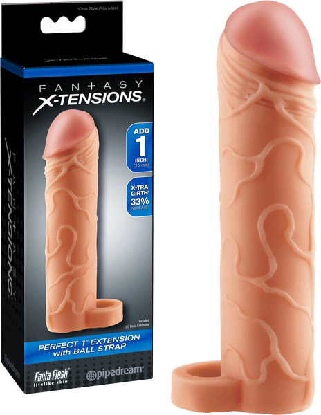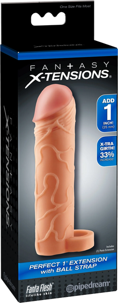 Intensify pleasure for both of you with The Perfect 1" Extension with Ball Strap. With the ball strap wrapped snug around you, you'll prolong ejaculation for the most explosive climax you've ever imagined. Your partner will enjoy deeper penetration with the 1" extension at the tip, while the ultra-lifelike shaft makes you 33% thicker to offer a fuller feeling and exceptional climax. It's super-stretchy to accommodate most sizes, is tight enough to help you last longer, and the super-soft Fanta Flesh® material feels like a second skin--only better!