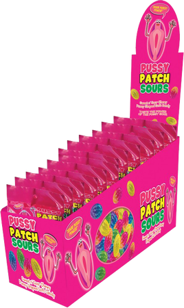 Sweet & Sour Pussy Shaped Soft Candies in various fruit flavors. Counter display holds 12 bags.