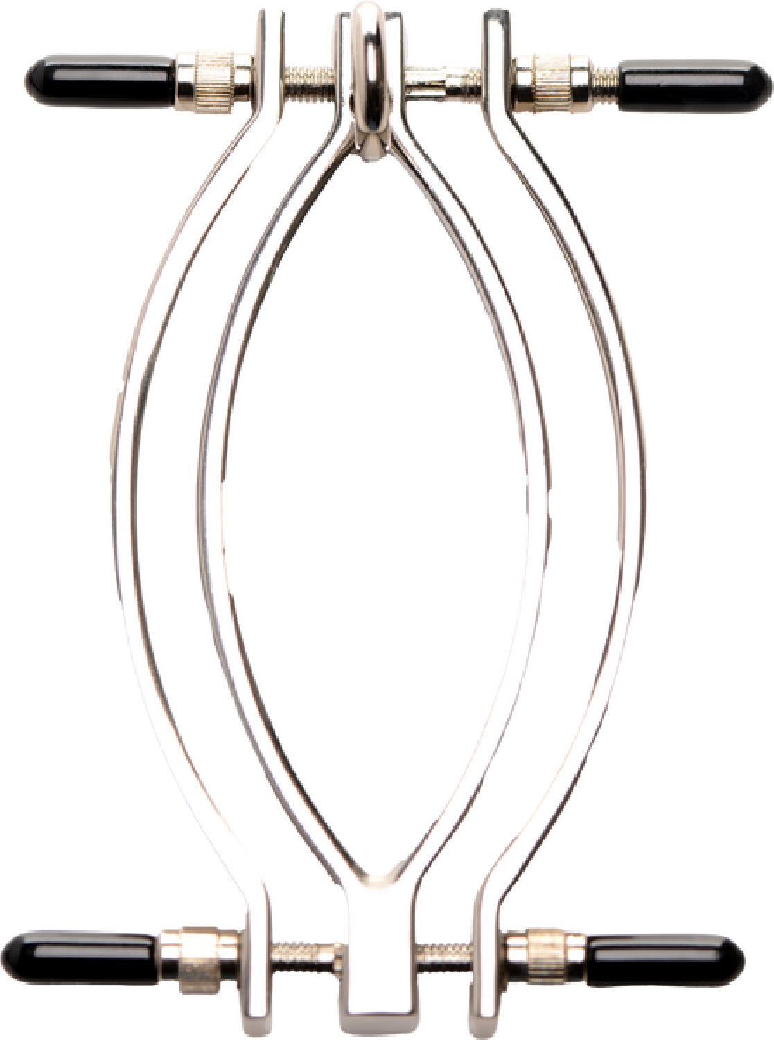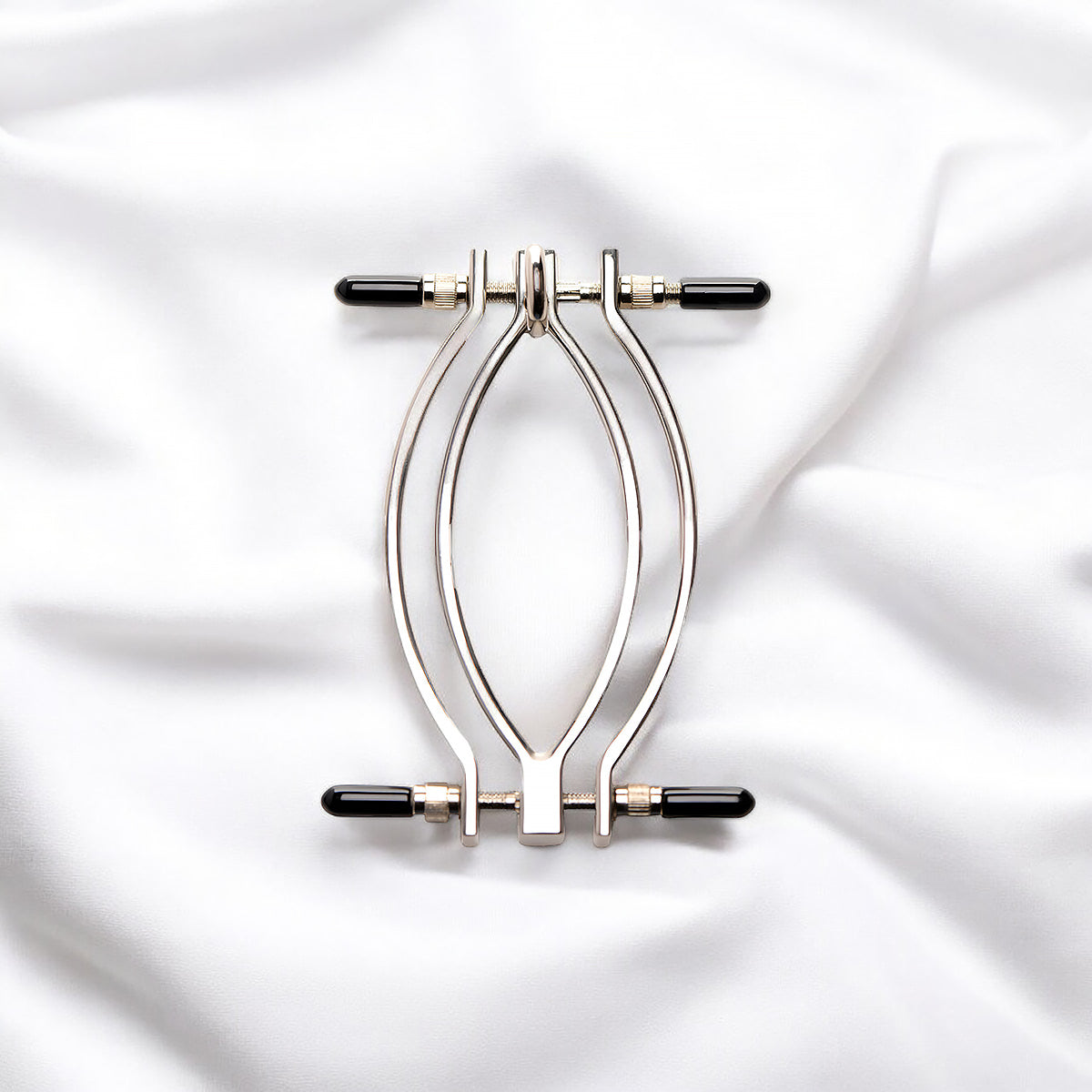 Use a recently cleaned Pussy Tugger on your partner after they’ve warmed up. To add more sensation and temperature play, run the clamp under warm or cool water first! Make sure they have some circulation already going through their labia and clitoris, then begin to gently tug and pull at their labia so you can grab them without discomfort. Begin to place the clamp on their labia while the clamps are open and wide apart. If starting on the right, gently pinch the upper right labia and pull it between the clamp on the right. Start using your other hand to twist the screw and begin to clamp down. Have your partner hold their labia or the clamp as you do this to make this more easy. Do the same on the top left, then the bottom right and left sides. Adjust as you need to make things even and comfortable. Talk to your partner and check in to see what feels good and what feels like too much pressure. Once everything feels good, attach the chain leash and play with tugging at their labia to tease and arouse them! Lead them around by the pussy for fun, and see what else can be stimulated as well!