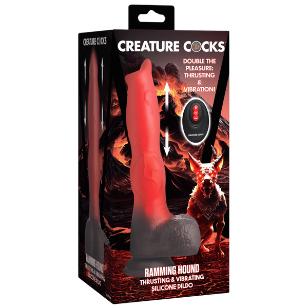 The hell hound is back and he's ready to ram down your doors! Made out of premium silicone, it is squishy yet firm with phthalate-free, body-safe material you can trust. The red shaft is long with canine knots adobe the brown base and heavy balls. The shaft will ram you with 3 speeds and 4 patterns of thrusting and vibration! Use the battery-operated remote to switch settings yourself or hand it to your partner! Indulge in any kinky cosplay, far-out fantasy, or horror and sci-fi scene you or your partner dream up! This dong has a suction-cup base for hands-free, solo rides too! Rated IPX7 waterproof, it can be taken in the shower or submerged underwater in a bathtub for up to 30 minutes! Use only water-based lubricants for best results. The dildo is rechargeable via the USB cable provided.