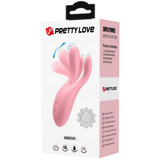 Beautiful vibrator from Pretty Love in a sophisticated, elegant design with three flexible 10 vibrating settings fingers, the middle one can even provides 5 nodding settings fun. Simultaneously stimulates the vagina and clitoris during solo play or specifically the nipples, testicles, penis, etc. when used with a partner. Ergonomically perfectly shaped and made of medical-grade silicone, the silky-soft Diego adapts perfectly to the body and movements. Exclusive comfort for maximum pleasure.