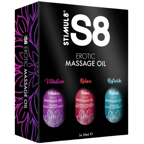 These rich S8 massage oils are a unique blend of 3 powerful oils: jojoba oil that soothes and strengthens the skin, almond oil for moisturizing and care and sesame oil which is highly nourishing and lubricating. This S8 oil is enriched with essential vitamins and minerals. After a good massage your skin will feel silky smooth and relaxed. This box includes 3 different scents: Omani Lime & Spicy Ginger, Green Tea & Lilac Blossom and French Plum & Egyptian Cotton.