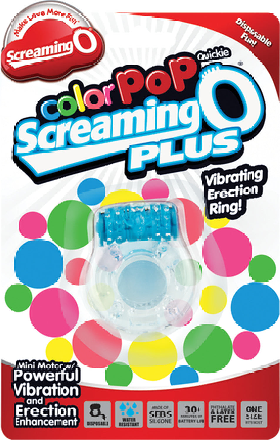 The ColorPoP Quickie Screaming O Plus vibrating erection ring keeps him harder longer with powerful vibration for her pleasure for better, more satisfying sex. This powerful vibrating cockring helps promote stronger erections by restricting blood flow to the penis while its vibrating motor provides clitoral stimulation that helps get her closer to orgasm with every stroke! Simply stretch the ring around the base of the penis and testicles – it will fit tight and snug – with the vibrating motor on top and switch it on for instant vibration! The ColorPoP Quickie Screaming O Plus is a great couples ring for beginners, first-timers, new couples, or men looking for a quick “boost” in the boner department, but powerful enough for experienced couples and cock ring connoisseurs. Now available as a convenient ColorPoP Quickie, couples can enjoy vibrant vibration at home or on the go with a disposable design they can take anywhere!