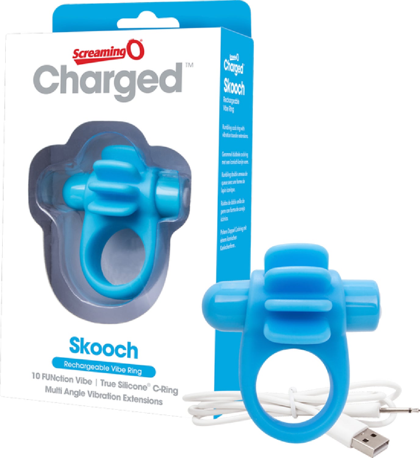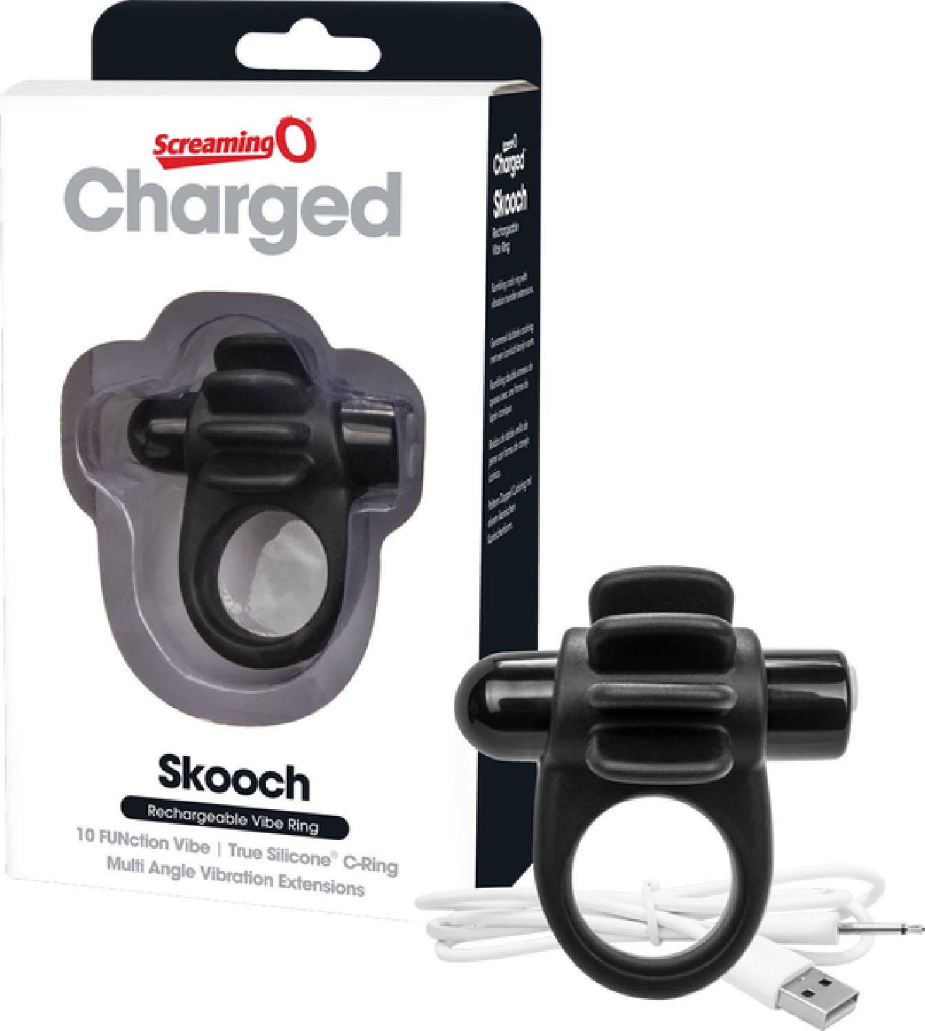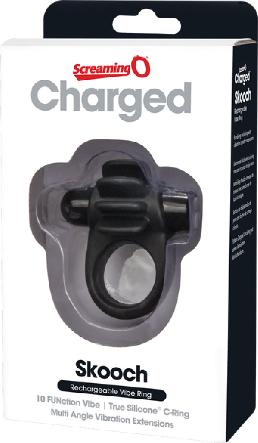 Enjoy textured stimulation with Charged Skooch™, a rechargeable vibrating cock ring equipped with four firm-yet-flexible fin-like extensions that tremble with deep, rumbling Vooom® vibration. Sweep, rub or grind your way to deeper stimulation and enjoy 10 powerful FUNctions that flow through Charged Skooch’s smooth silicone fins for the most satisfying sensation. This unique vibrating cock ring also features a wider band that fits around the penis or penis and testicles (your choice!) with a more comfortable snug and secure fit. Charged Skooch is made of lab-tested, body-safe True Silicone®, is completely waterproof, and comes with a limited 2-year warranty to assure ultimate customer satisfaction.