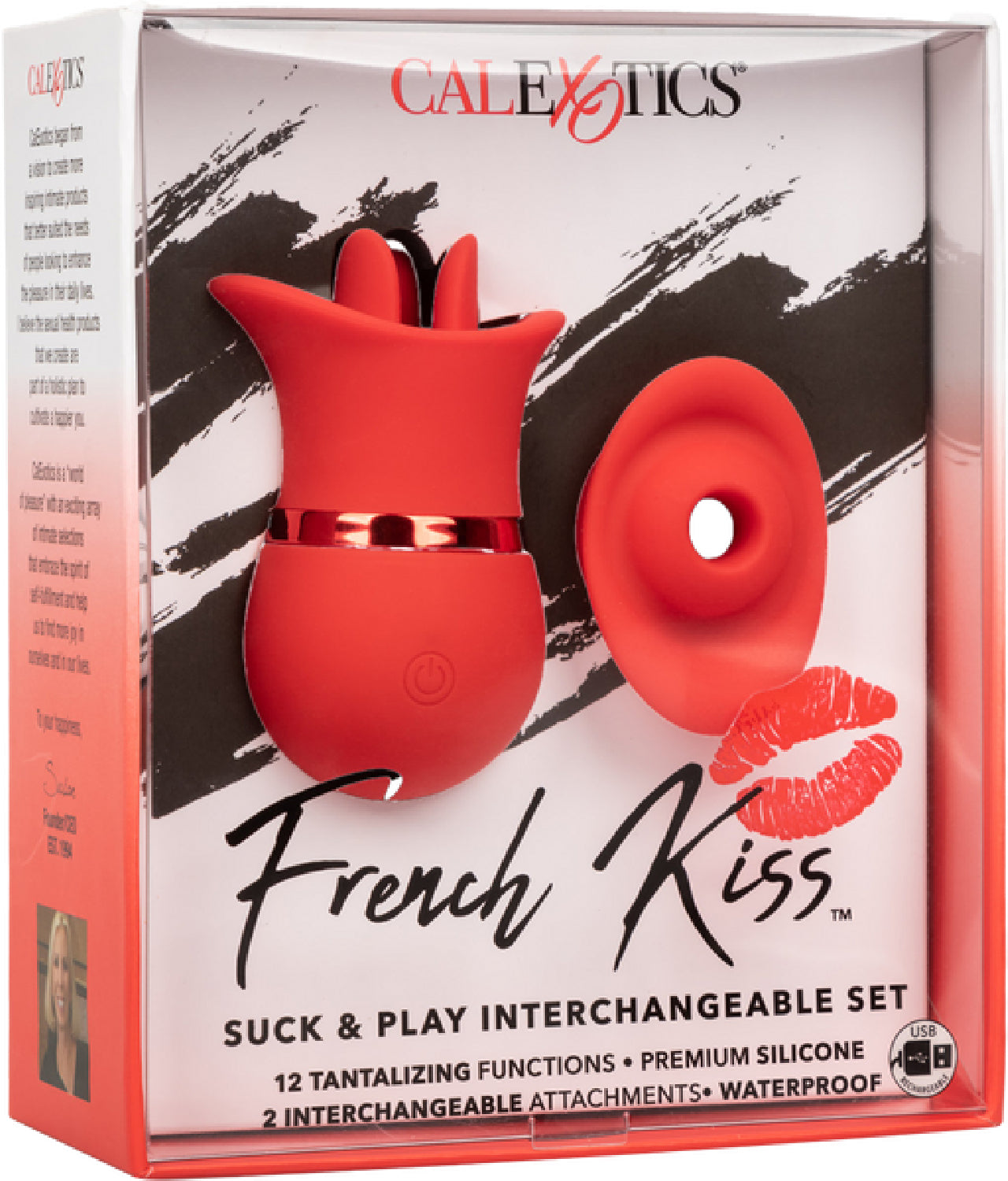 Twice the pleasure, oh la la! The sensual French Kiss™ Suck & Play Interchangeable Set knows just what you need with 2 interchangeable attachments with 12 functions of vibration or 12 functions of suction.