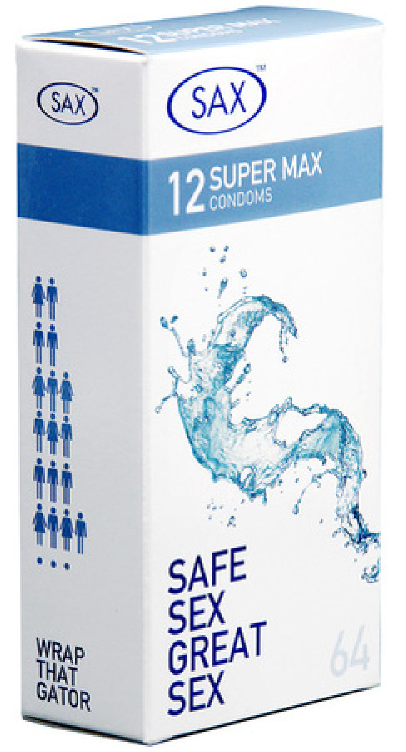 Biggest yet still sensitive. Super Max 64mm nominal width. Pack of 12 straight shafted smooth latex condoms |