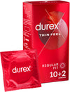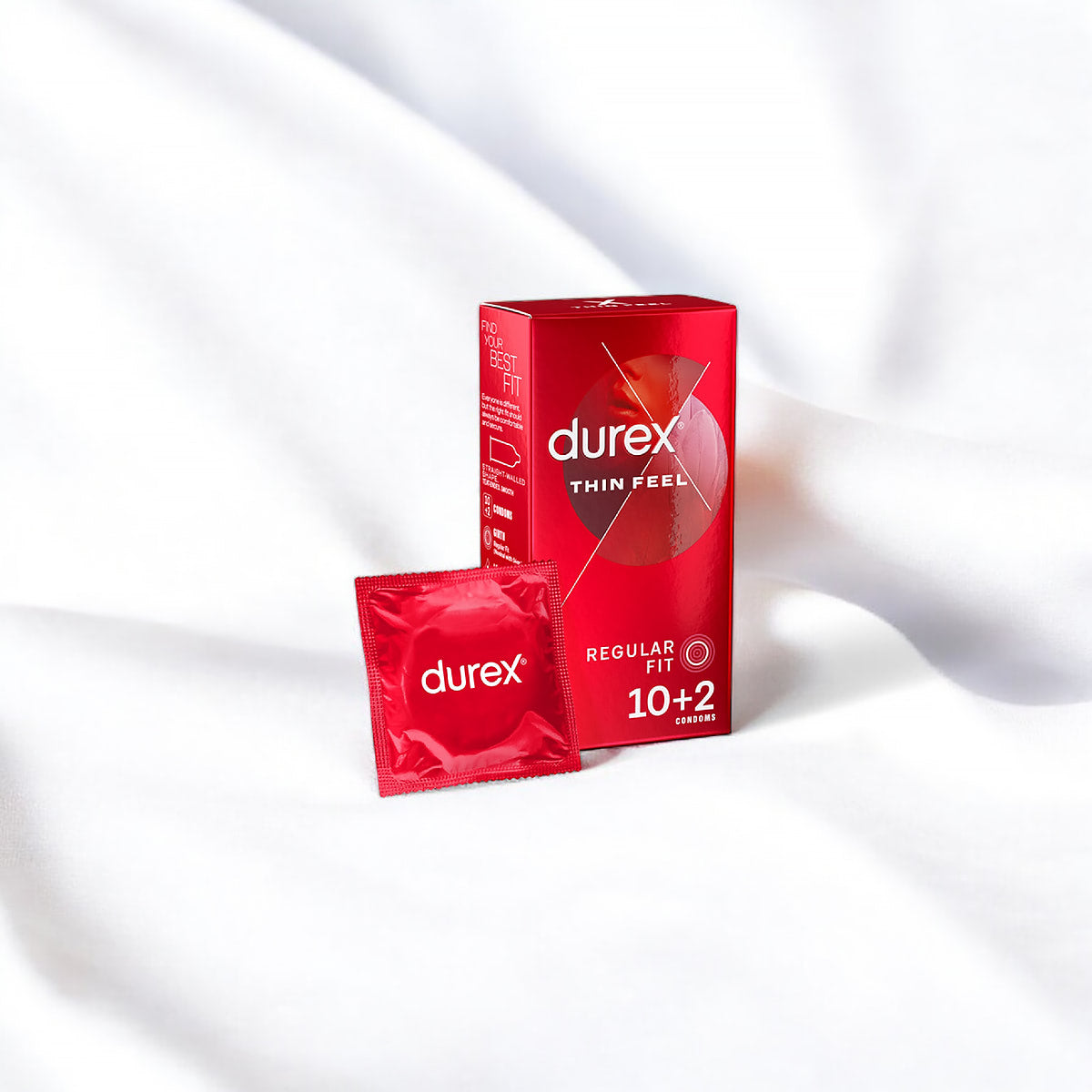 Everyone is different, but the right fit should always be comfortable and secure. Durex Thin Feel Condoms are 20% thinner than our Durex Original condoms. They're shaped to be easier to put on and thinner so you can feel even more than our Original condoms. Durex Thin Feel condoms offer even more sensitivity through ultra thin thickness. Dermatologically tested. 100% electronically tested with five more quality tests carried out on every batch. Comes in pack of 10+2.