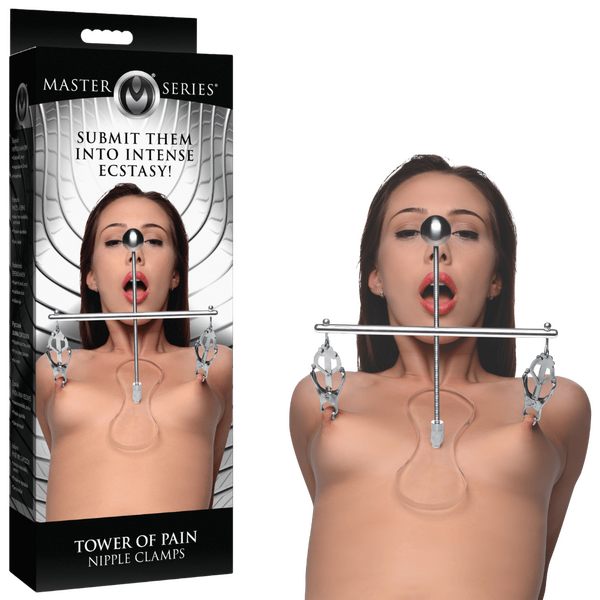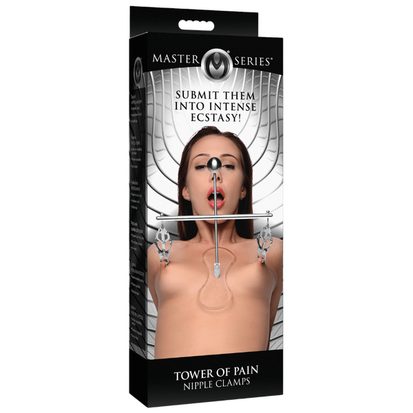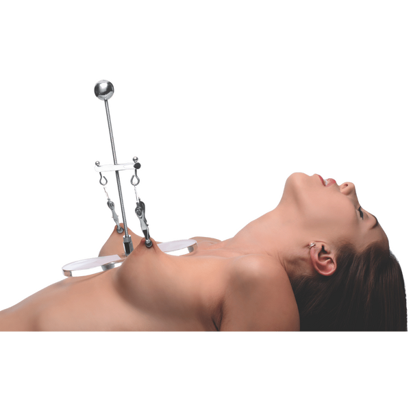 Put your submissive in a predicament pose they cant' escape with this Tower of Pain! This tower has clover-style nipple-clamps that increase in pressure when they're pulled on. The rubber tips protect the skin of the nipples and areola, but the pressure is wicked! The tower also adjusts in height so you can find the perfect height to torment them with! Made out of stainless steel, it is nickel-free and perfect for sensitive skin. The clear plastic acrylic pad sits between the nipples on their chest as a steady platform. It breaks down easily for storage or travel and can be cleaned with warm water and mild soap or a gentle cleaning solution.