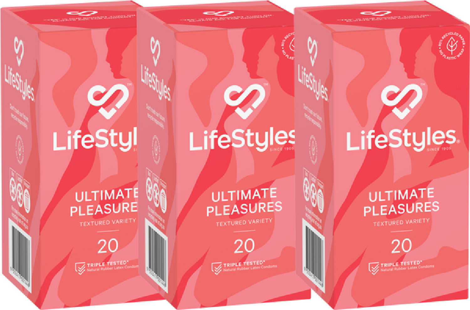 Ultimate Pleasures contain a variety of textured condoms designed to enhance stimulation and pleasure.