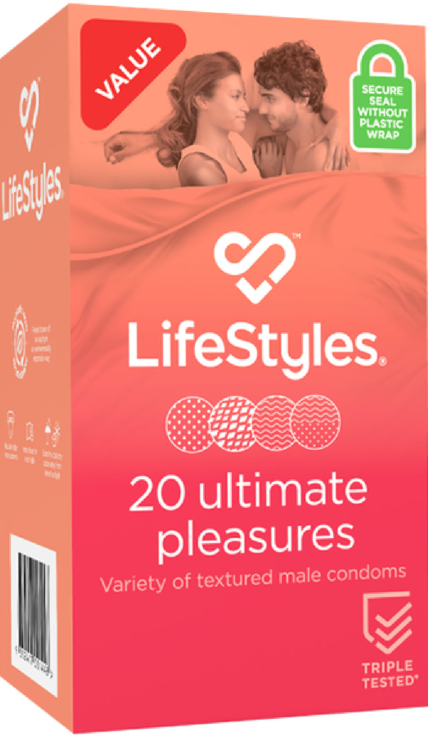 Ultimate Pleasures contain a variety of textured condoms designed to enhance stimulation and pleasure.
