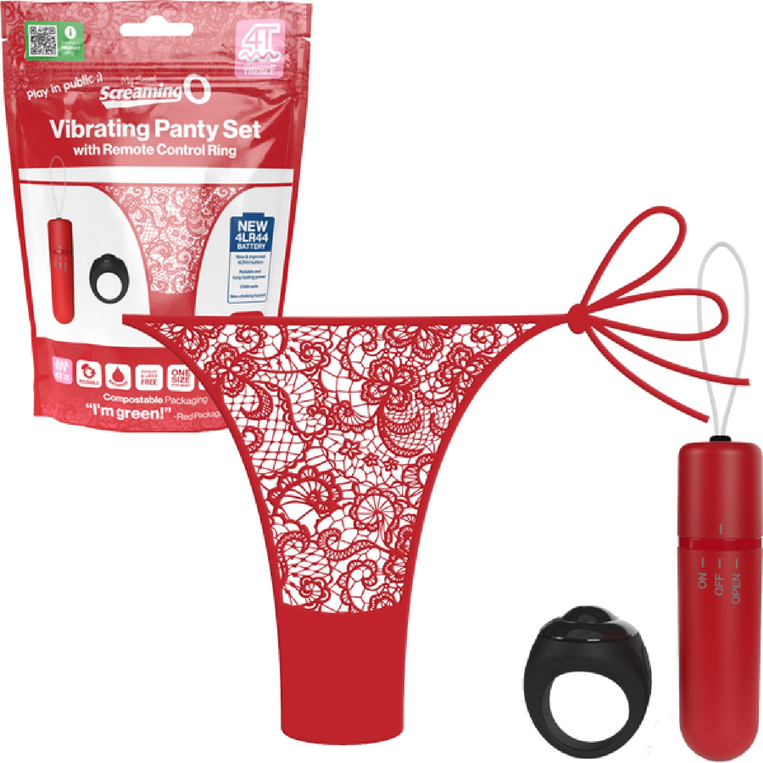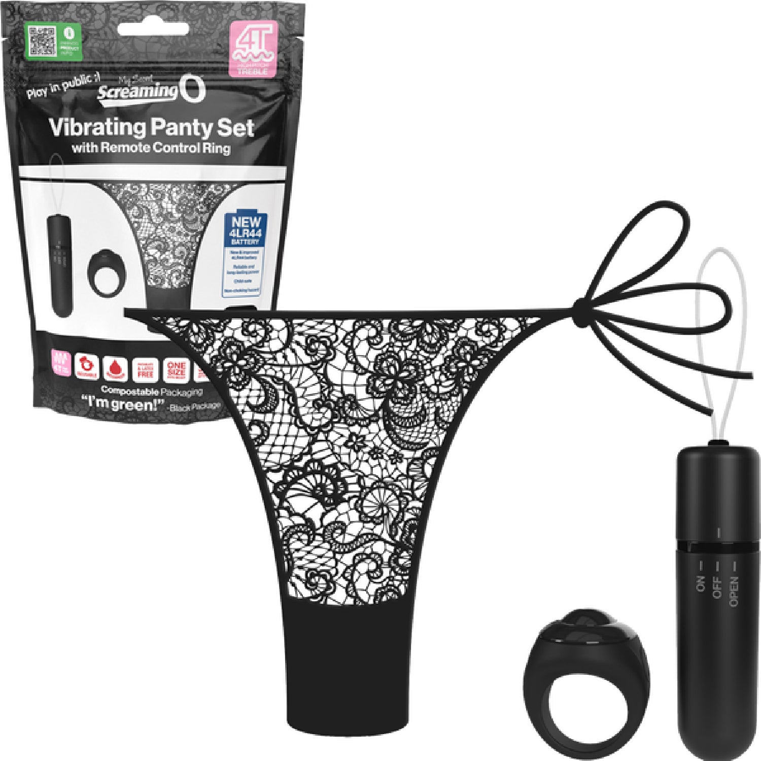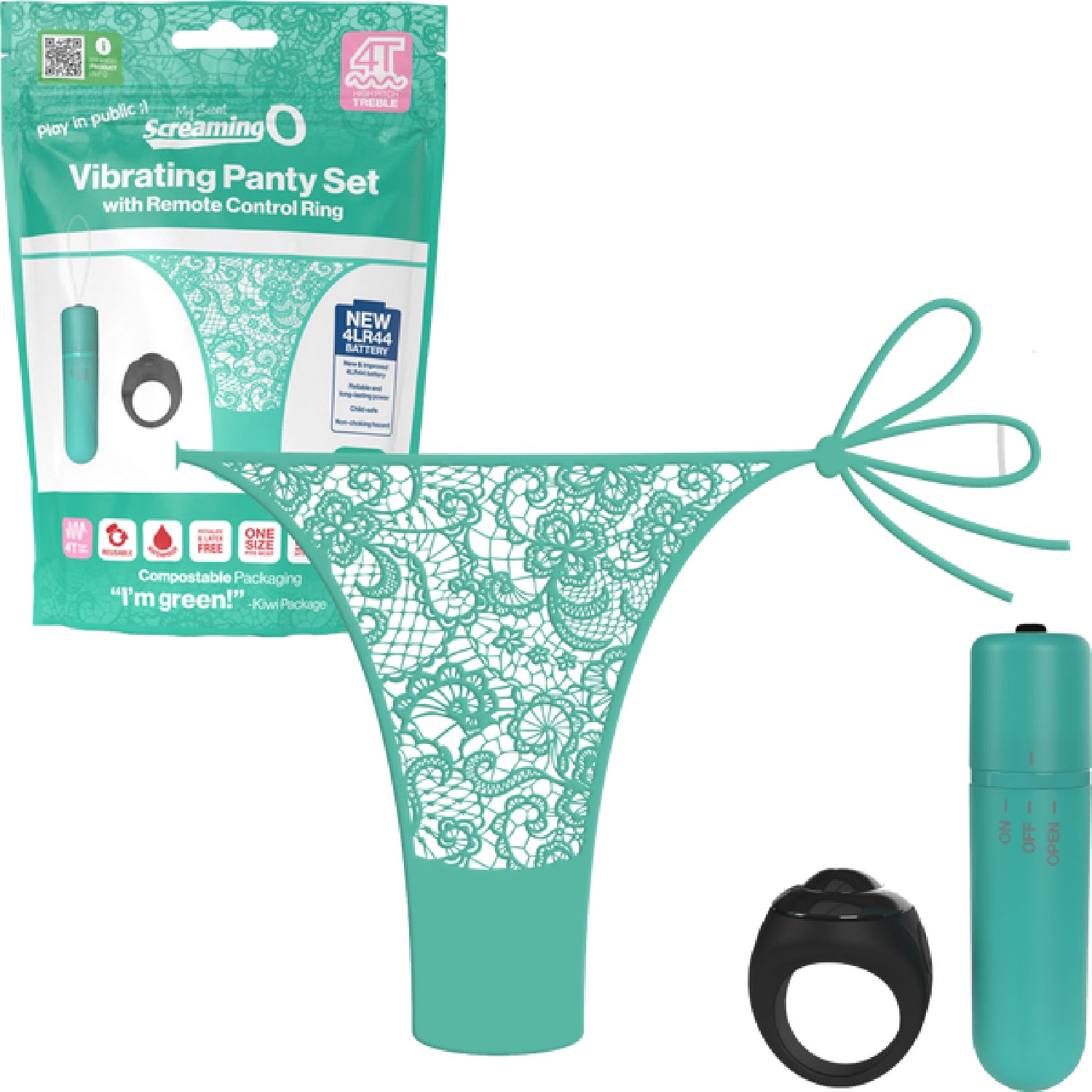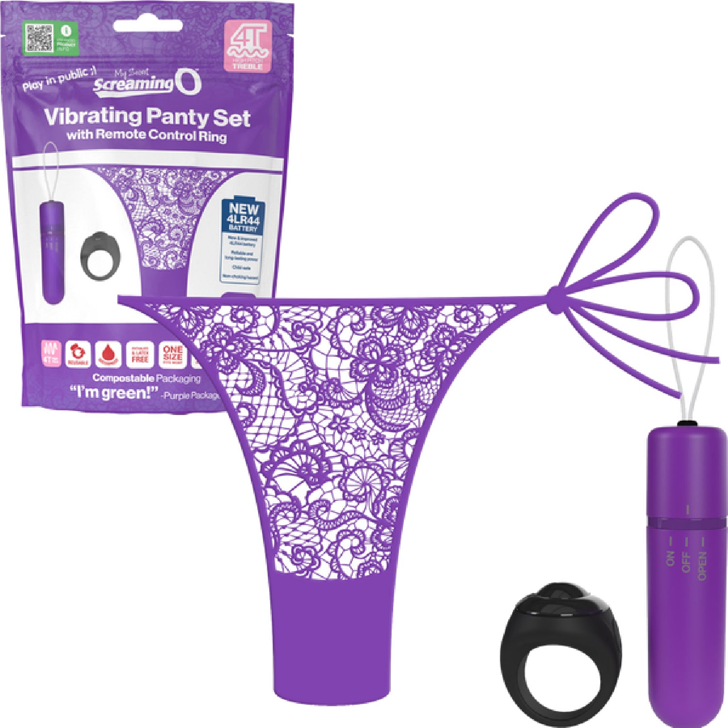 My Secret Screaming O 4T Panty Vibe puts the power of pleasure at your fingertips with a powerful 4T treble style tickle and tease vibrating bullet that fits discreetly into a side-tie lace panty to keep it in place. Simply slip the bullet into the panty’s small pocket and enjoy powerful stimulation directly on the sweet spot. This sexy and subtle mini vibe allows you play in public with a clever remote control disguised as an ordinary finger ring and works up to 50 feet away! The vibe is “monogamous” meaning it can only speak to one remote at a time. This way, you always know who is turning you on!The remote control makes it easy to shuffle through 10 different vibration functions that tease, please and titillate with the touch of a button. Watch as it induces squirming and quivering from across the room. Covert enough to wear under clothing while out on the town, this audacious sex toy lets couples experiment with public pleasure and spice up date night, adding a secret twist. Choose from four fashion-forward color schemes, perfect for any special occasion and make it a night to remember!