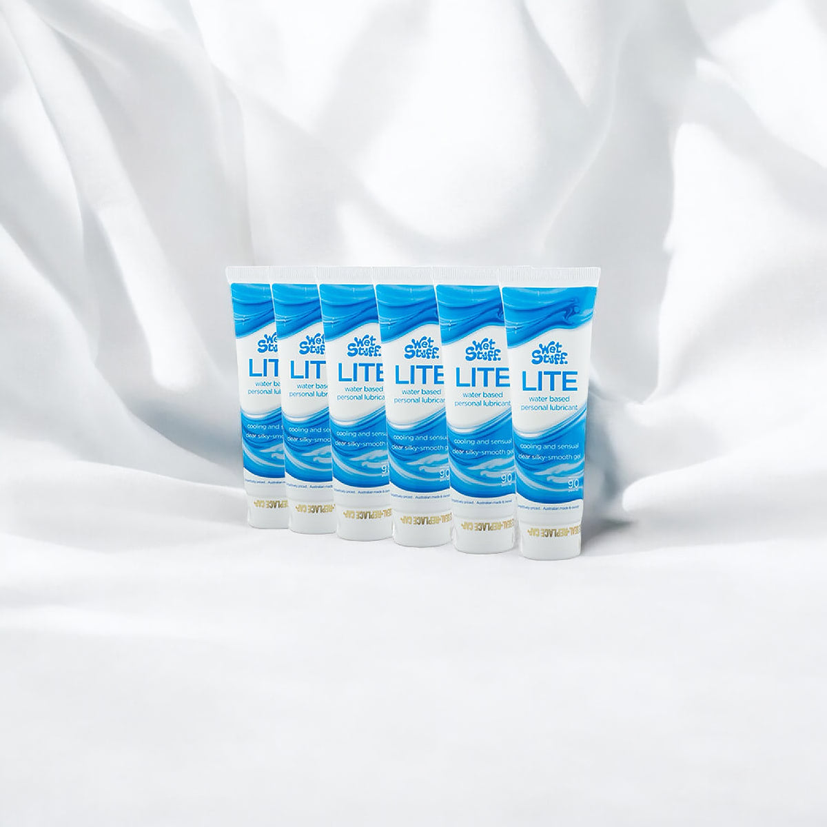Wet Stuff Lite is a very slippery, non sticky lube made for those that do not need much more assistance from a lube. Wet Stuff Lite is cooling to the skin and contains much less glycerine than longer lasting lubes. Lite is made for women who are too sensitive to be able to use the longer lasting lubes. It's inexpensive and if you don't need a lube that just lasts and lasts why pay for it. Wet Stuff Lite is one of a small number of water based lubes that do not need to be washed off.